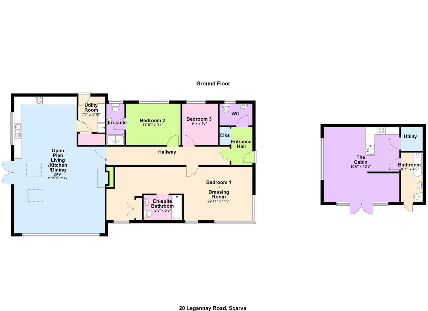 The detached bungalow and cabin are situated with an approx boundary of 1.1 acres including woodland both accessed by private laneway and with the property sitting on a slightly elevated site, the views are exceptional.