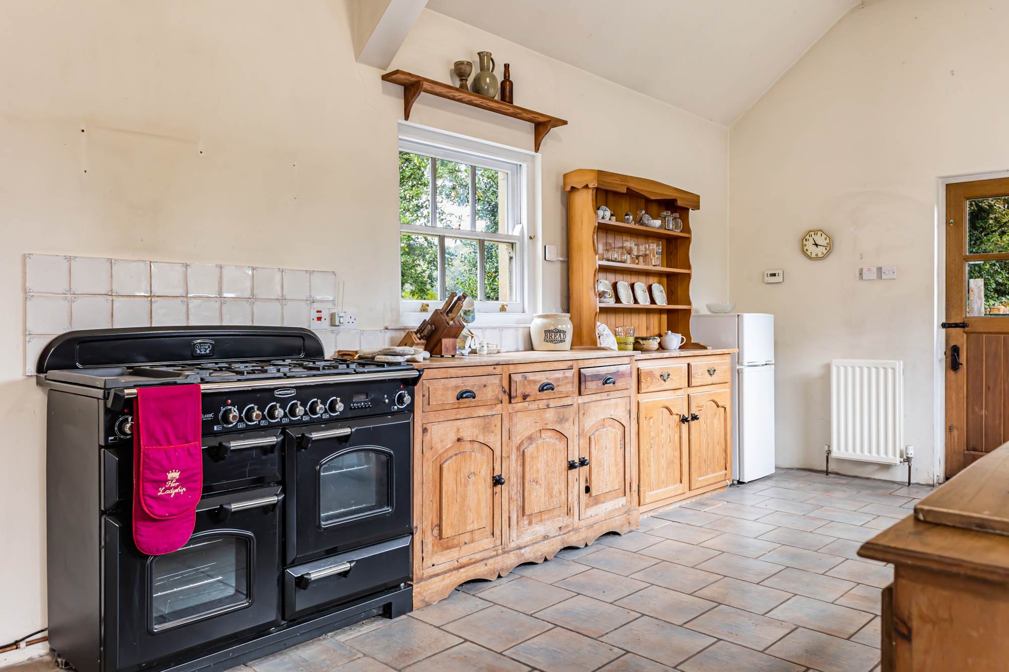 At widest points. Kitchen with high and low level units, solid wooden worktops, Belfast sink with chrome mixer tap, plumbed for washing machine, space for fridge/freezer, space for range style cooker , tiled floor, high vaulted ceiling, exposed stone wall, square window with dining area, stable style door with glazed inset leading to rear patio garden, further glazed access door leading to rear courtyard.