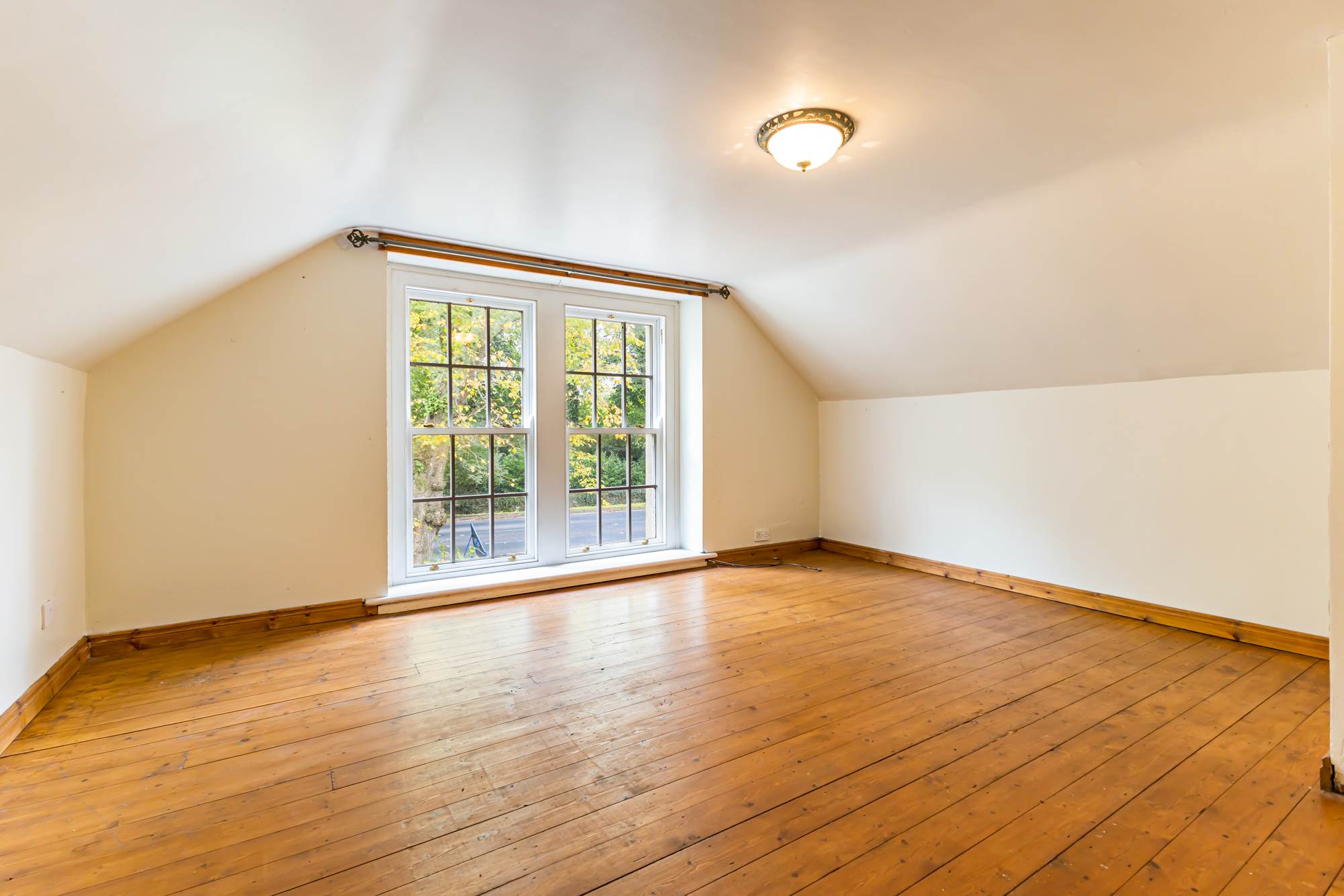 Original wooden staircase, church style picture window with outlook to main road, solid strip wooden floor.