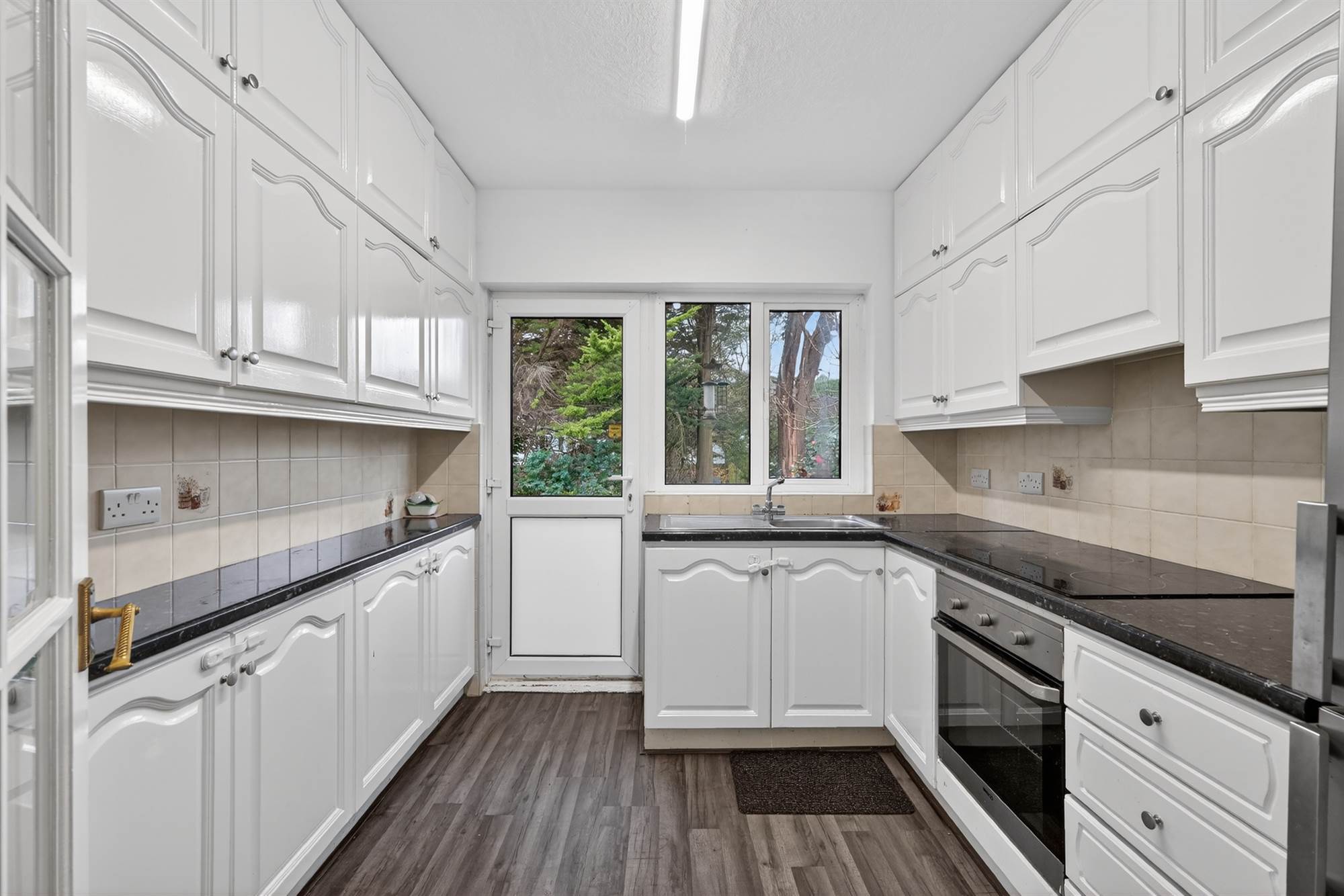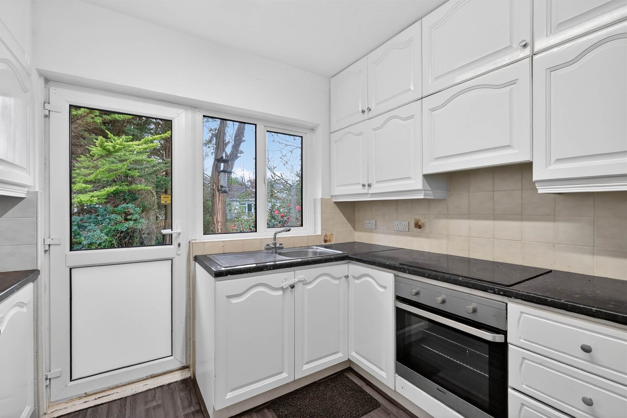 Fully fitted kitchen with range of high and low level units, laminate work surfaces, stainless steel sink unit with mixer tap, four ring hob, oven, space for fridge/freezer, uPVC double glazed door to rear.