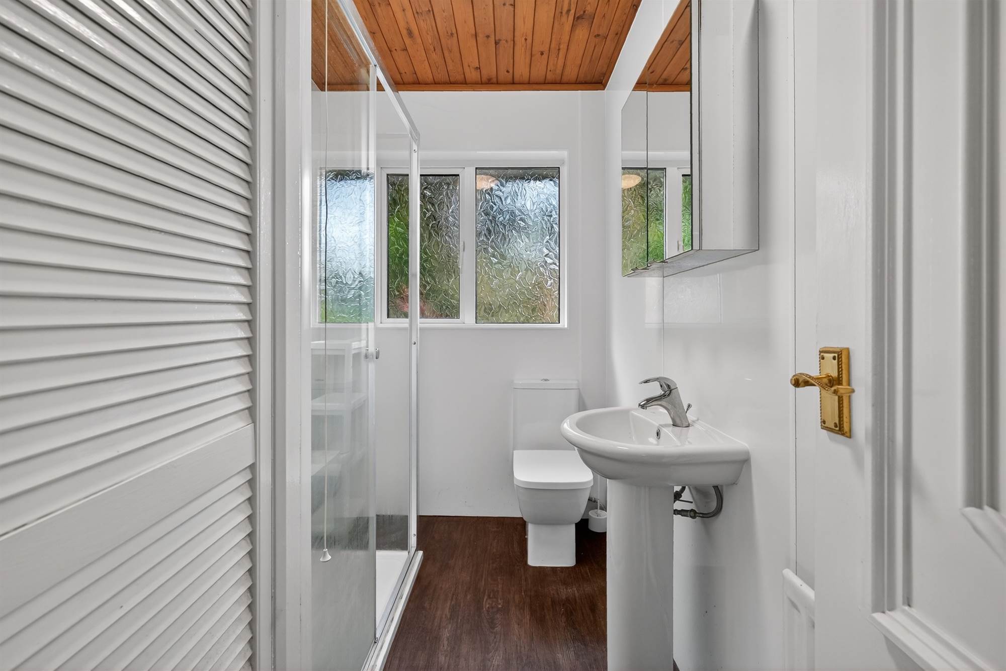 Fully tiled shower enclosure with Mira shower unit, low flush wc, pedestal wash hand basin.