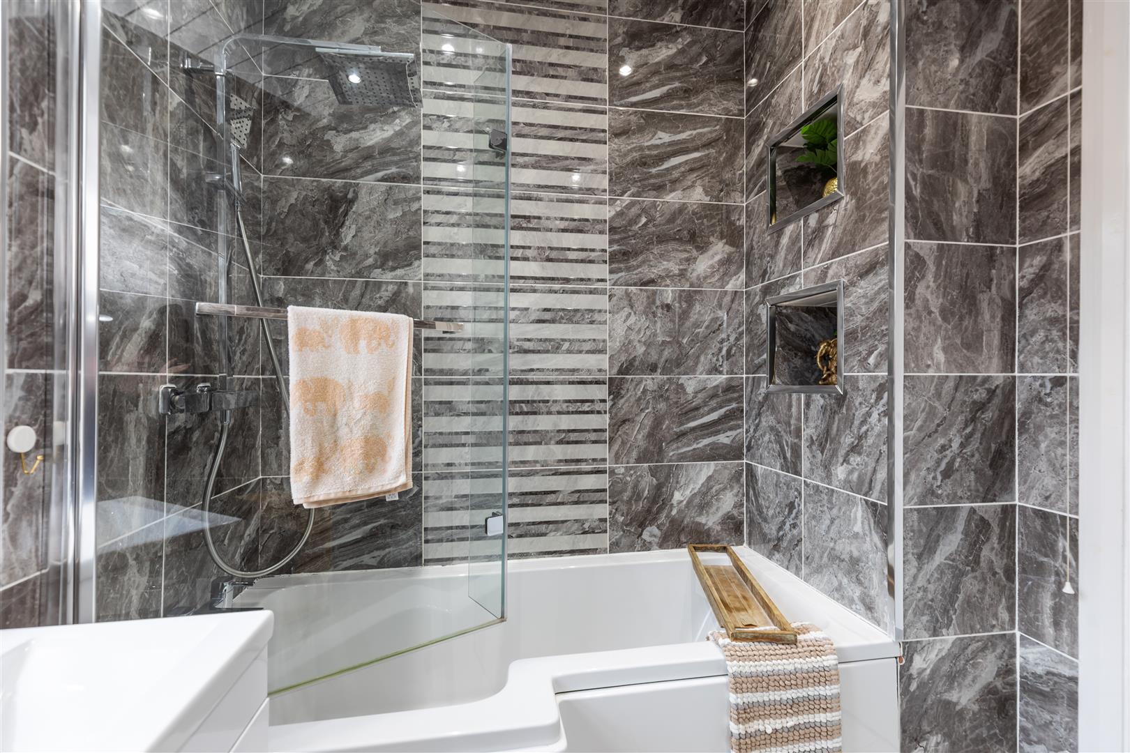 Luxury white bathroom suite comprising panelled bath, drench shower, vanity unit, low flush wc, fully tiled walls, pvc ceiling, ceramic tiled floor, recessed lighting.