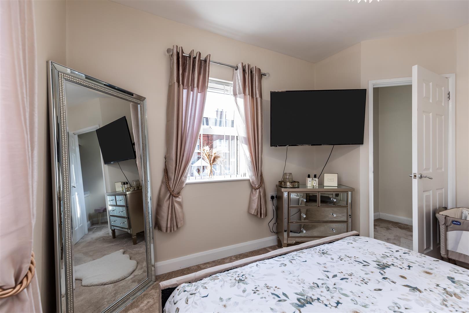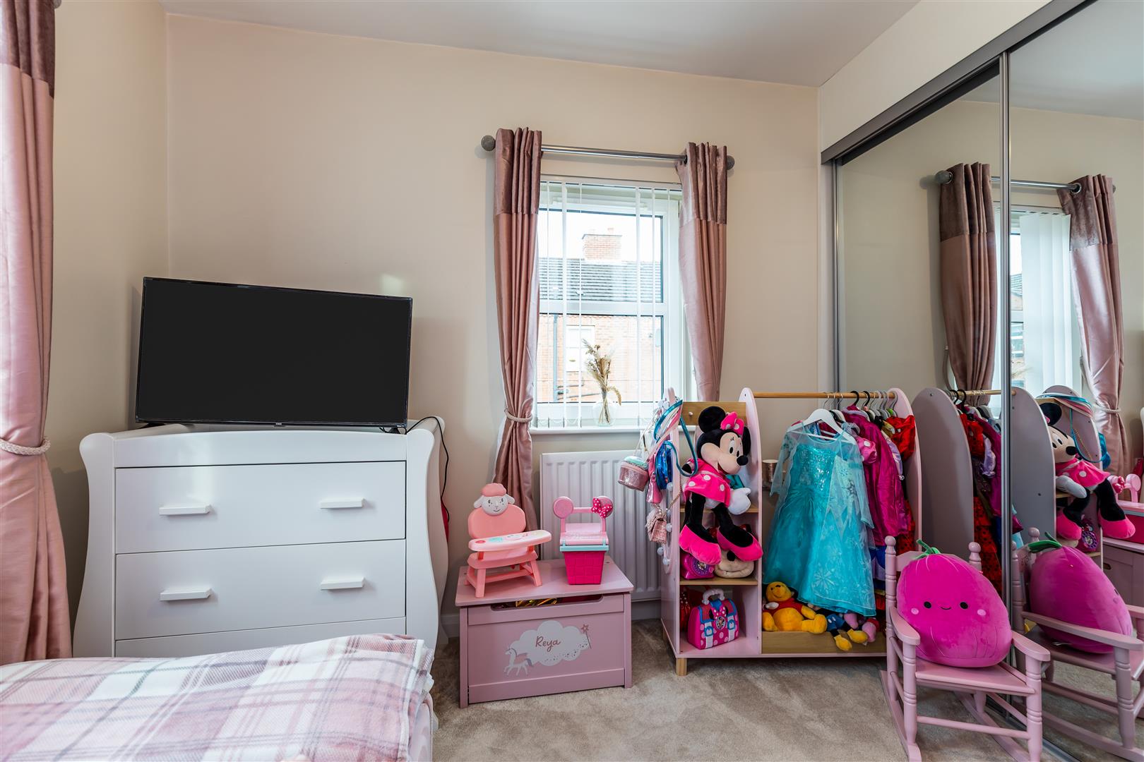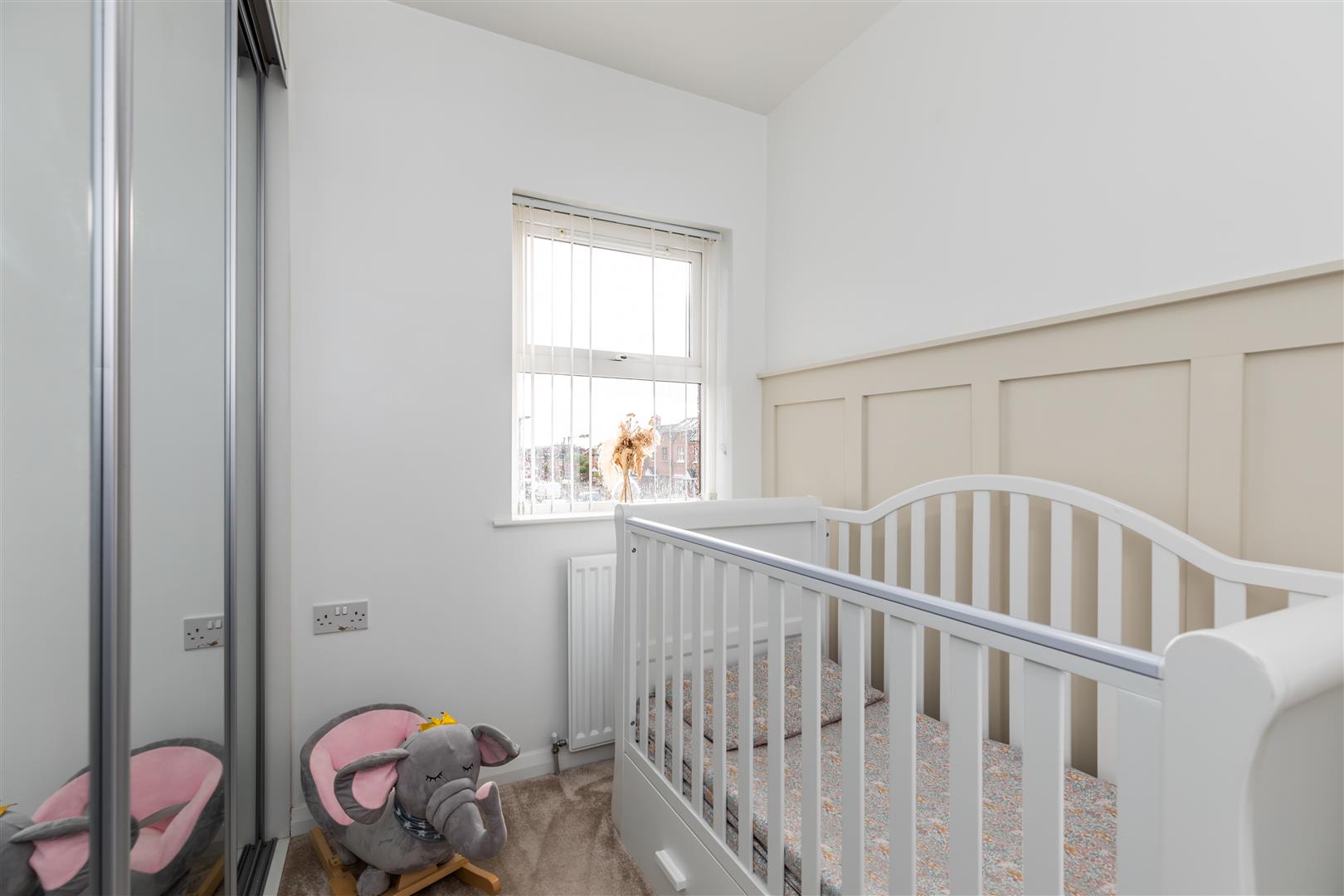 Built-in mirrored slide robes, partly panelled walls, panelled radiator.