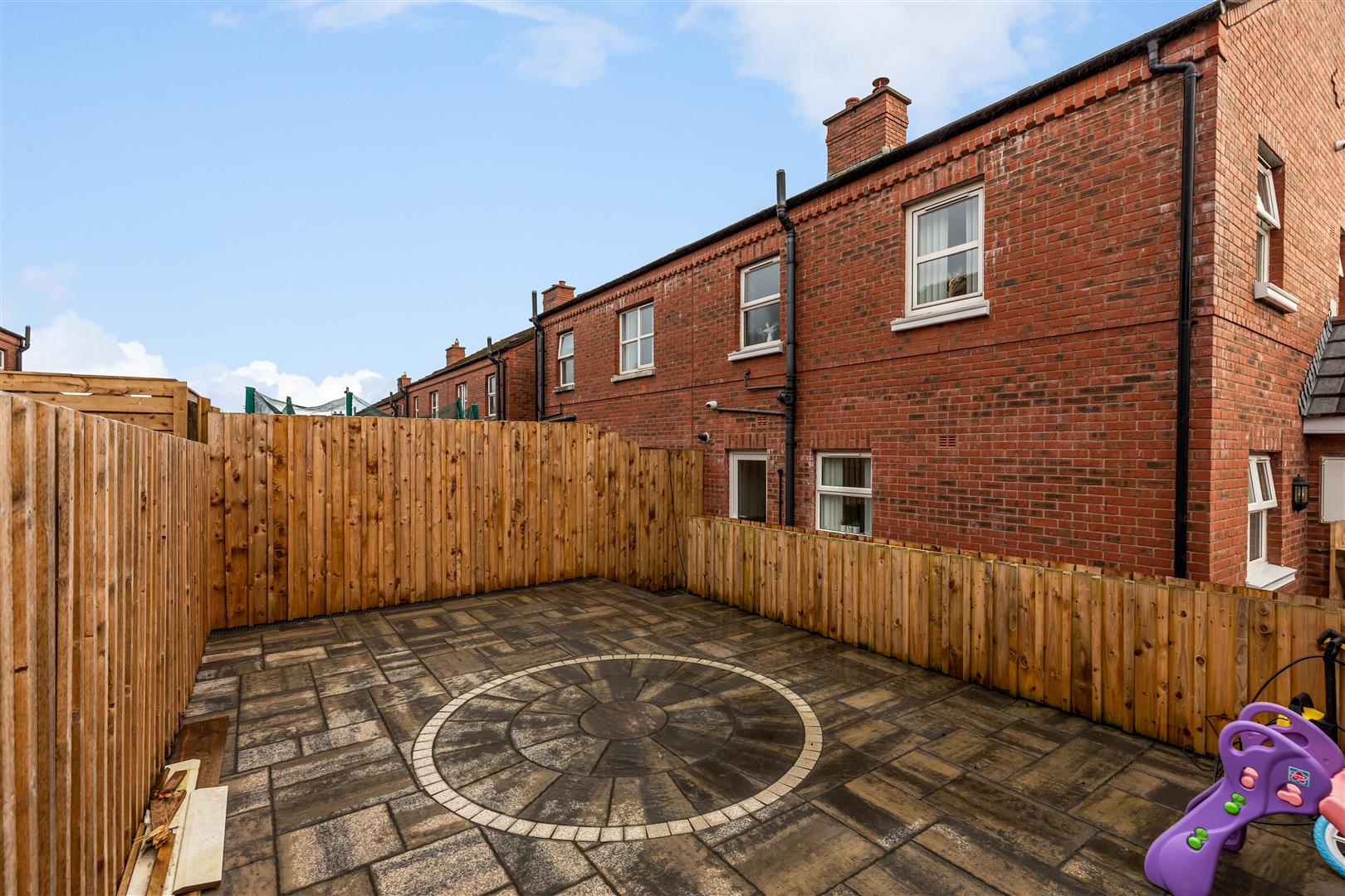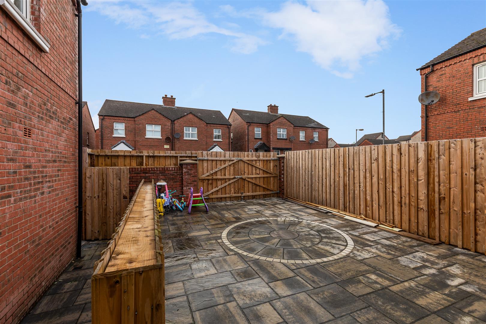 Hard landscaped private side garden offering off street carparking. Mature lawn to front and side.