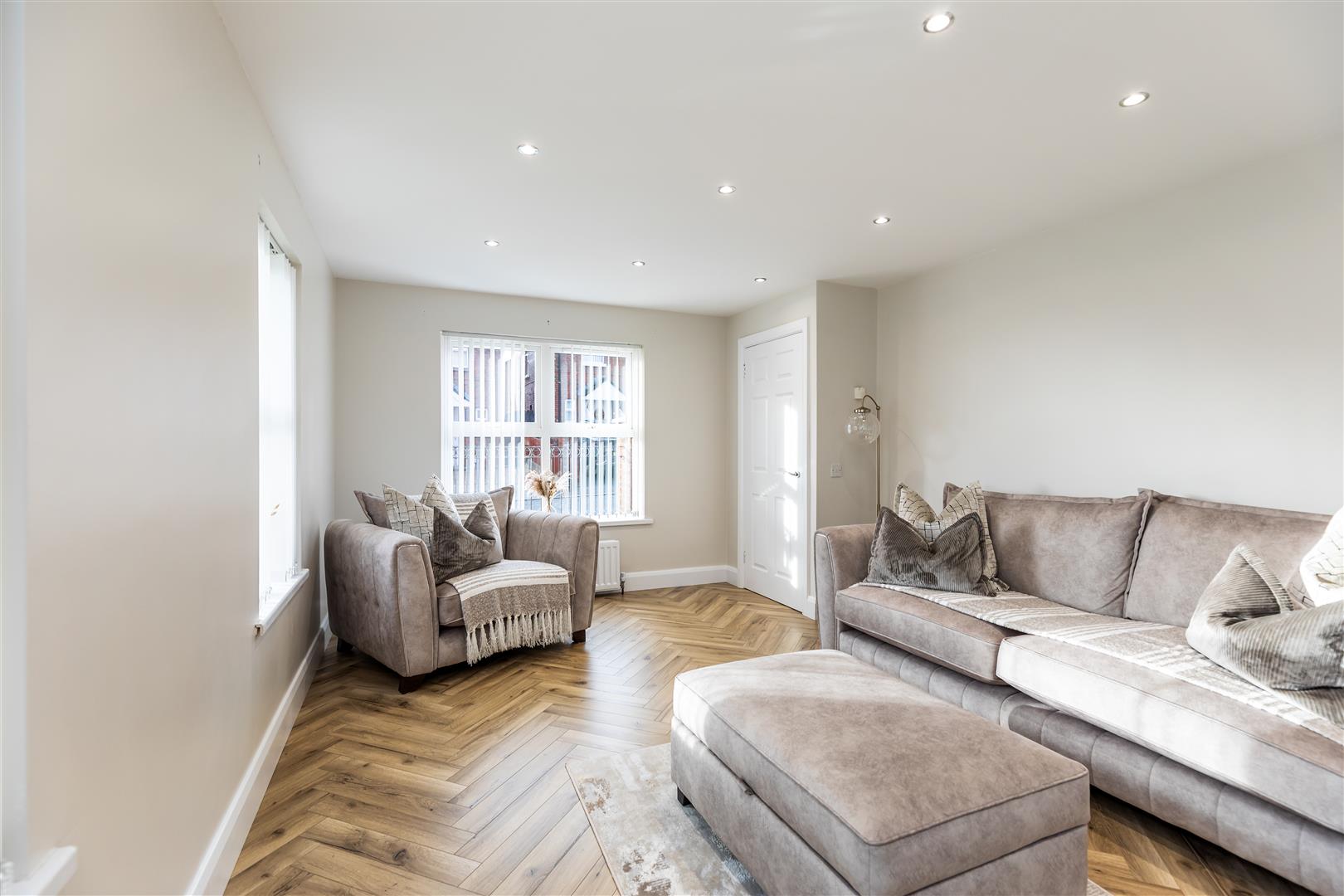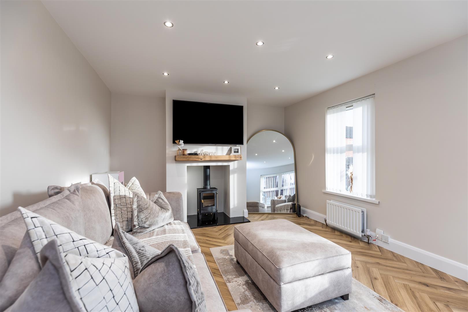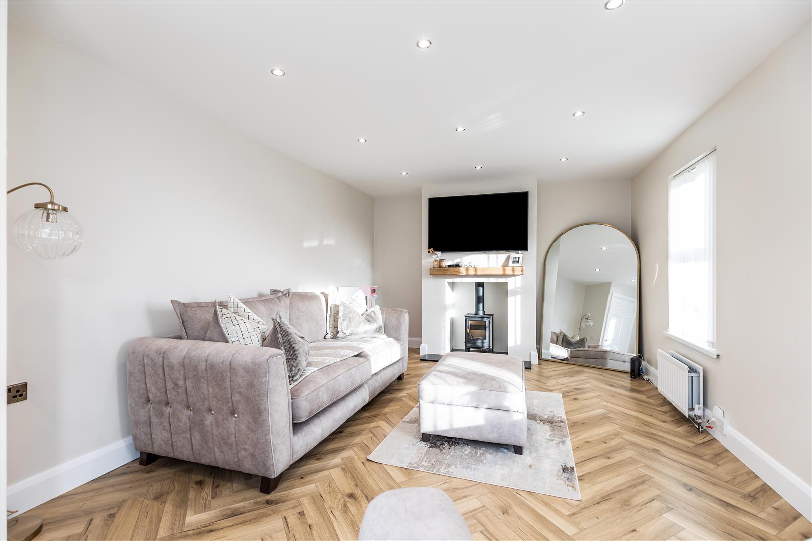 Multi-fuel stove, herringbone floor, double panelled radiator x2, recessed lighting.