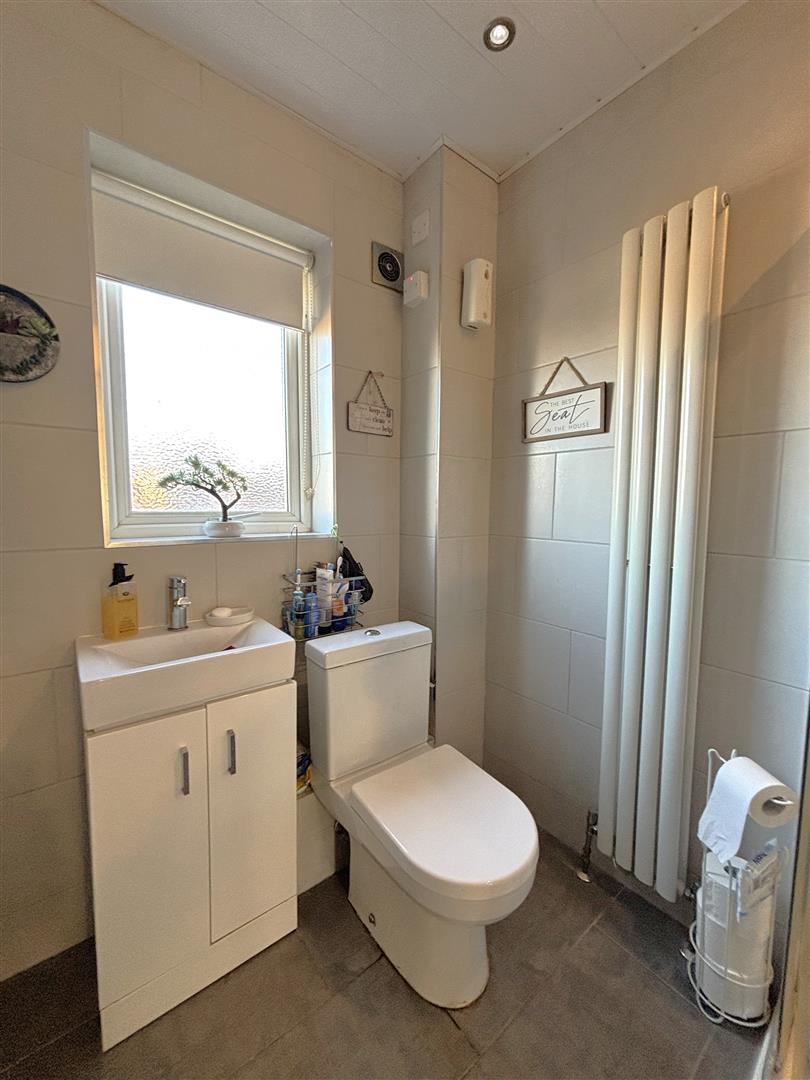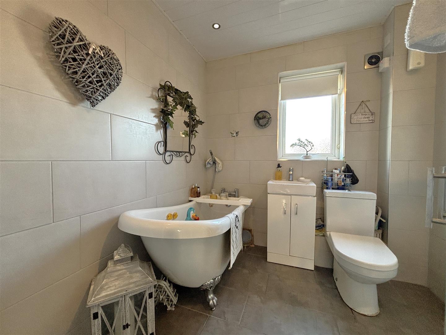 Modern white 4 piece bathroom suite comprising freestanding bath, shower cubicle, vanity unit, low flush wc, featured radiator, fully tiled walls, pvc ceiling, recessed lighting.