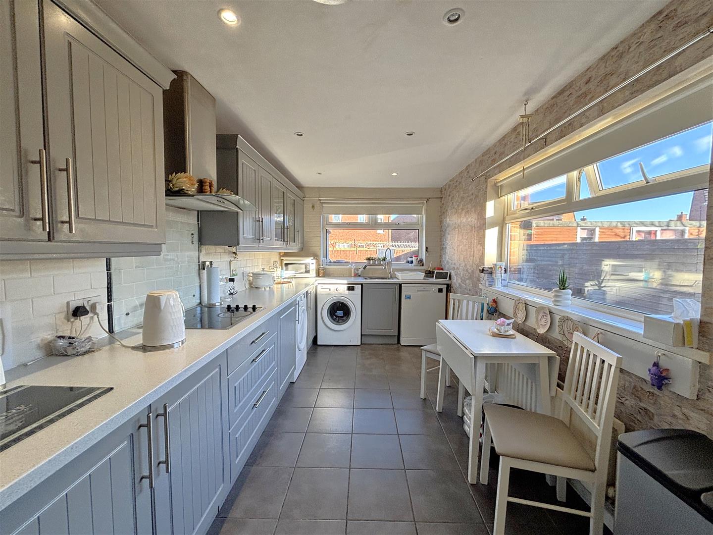 Single drainer stainless steel sink unit, extensive range of high and low level units, formica worktops, built-in double oven and ceramic hob, stainless steel extractor fan, fridge/freezer space, plumbed for washing machine, tumble dryer space, dishwasher space, partly tiled walls, ceramic tiled floor, recessed lighting.