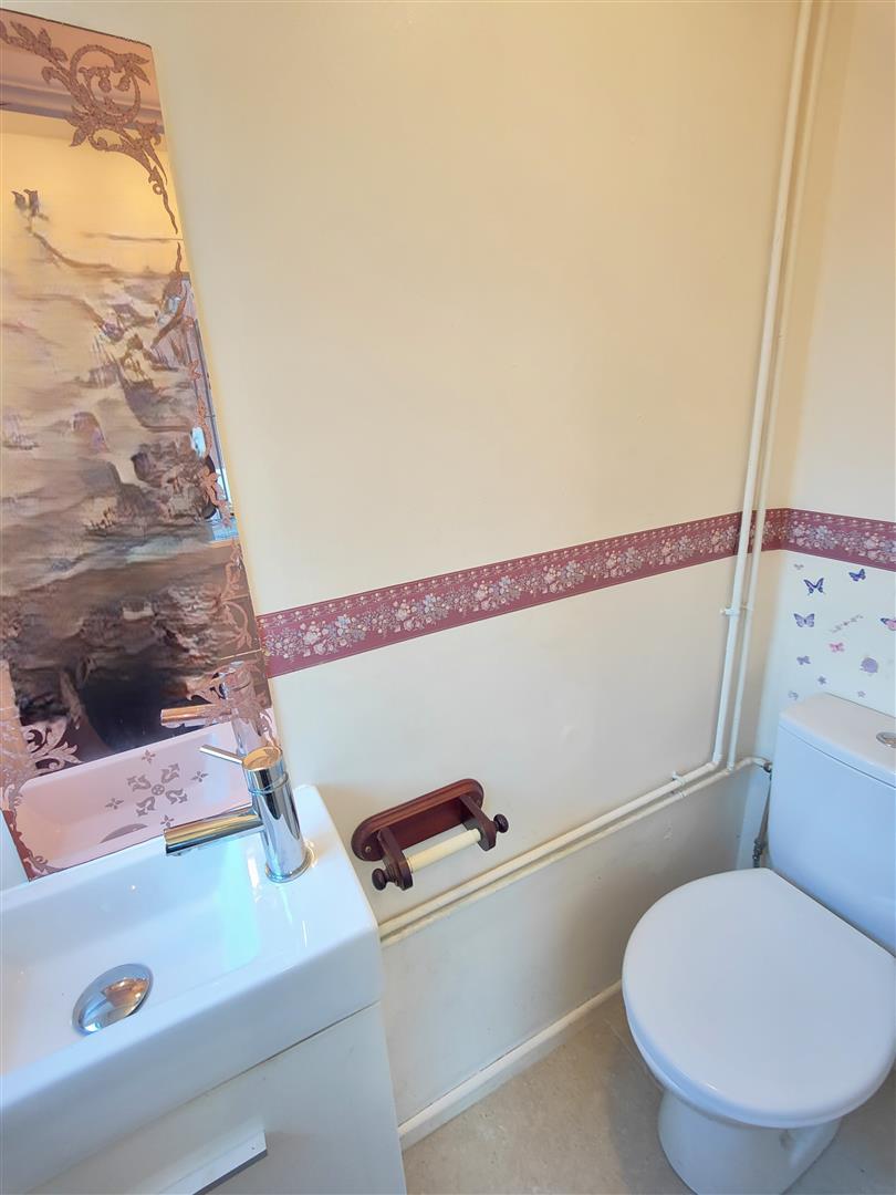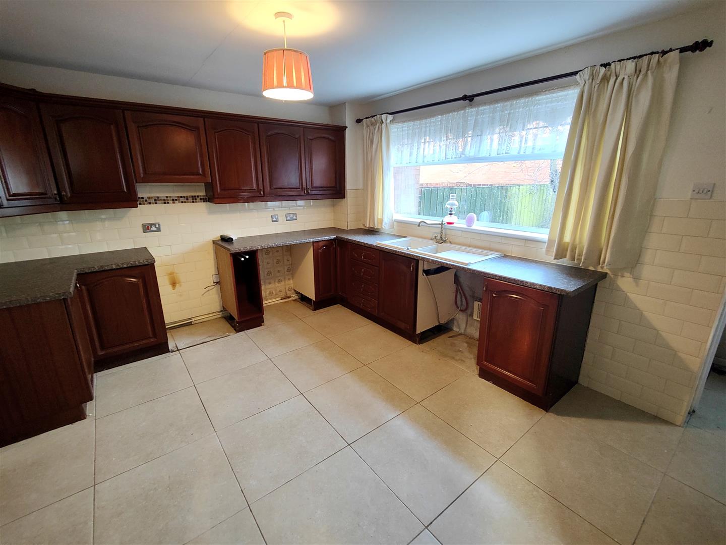Composite bowl and a half sink unit, range of high and low level units, formica worktops, cooker space, integrated extractor fan , fridge/freezer space, plumbed for washing machine, partially tiled walls, ceramic tiled floor.