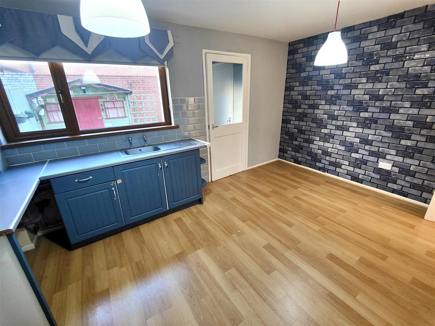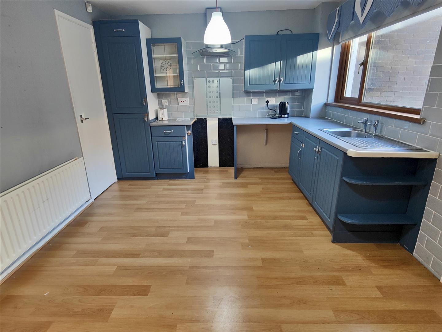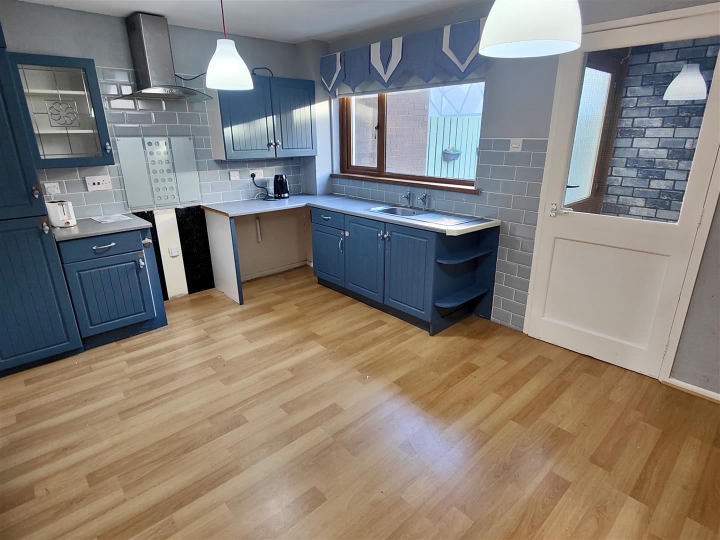Single drainer stainless steel sink unit, range of high and low level units, formica worktops, cooker space, stainless steel canopy extractor fan, fridge/freezer space, plumbed for washing machine, larder cupboard, double panelled radiator, understairs storage, wood laminate floor.