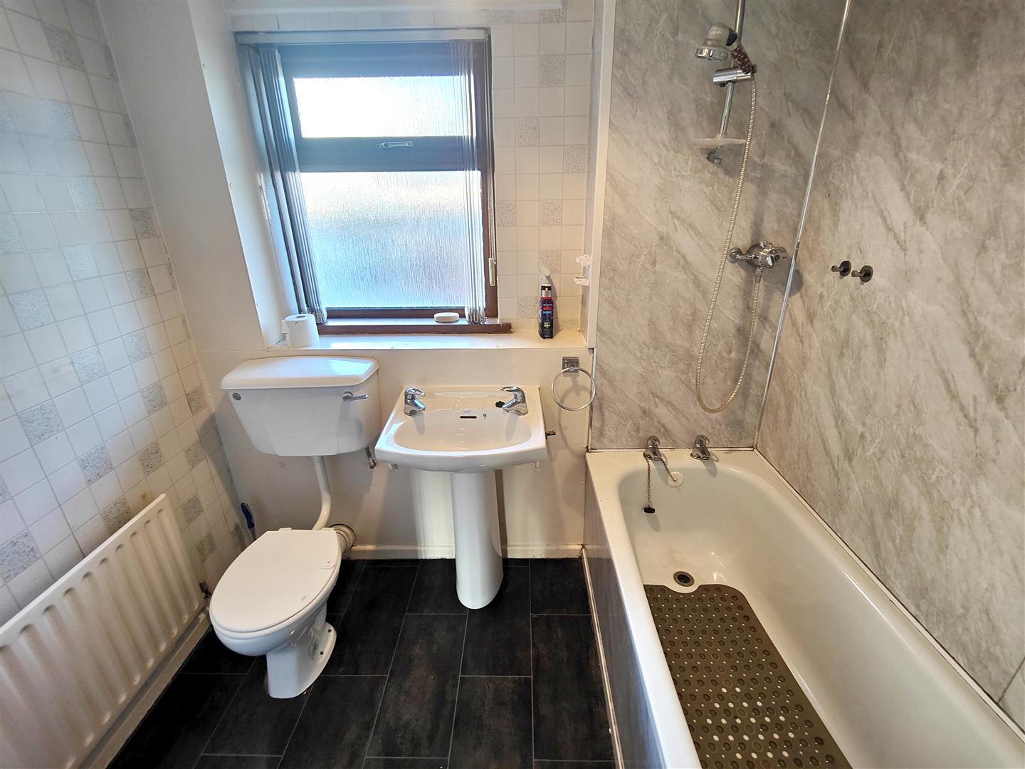 White bathroom suite comprising panelled bath, pedestal wash hand basin, low flush wc, pvc walls, panelled radiator.