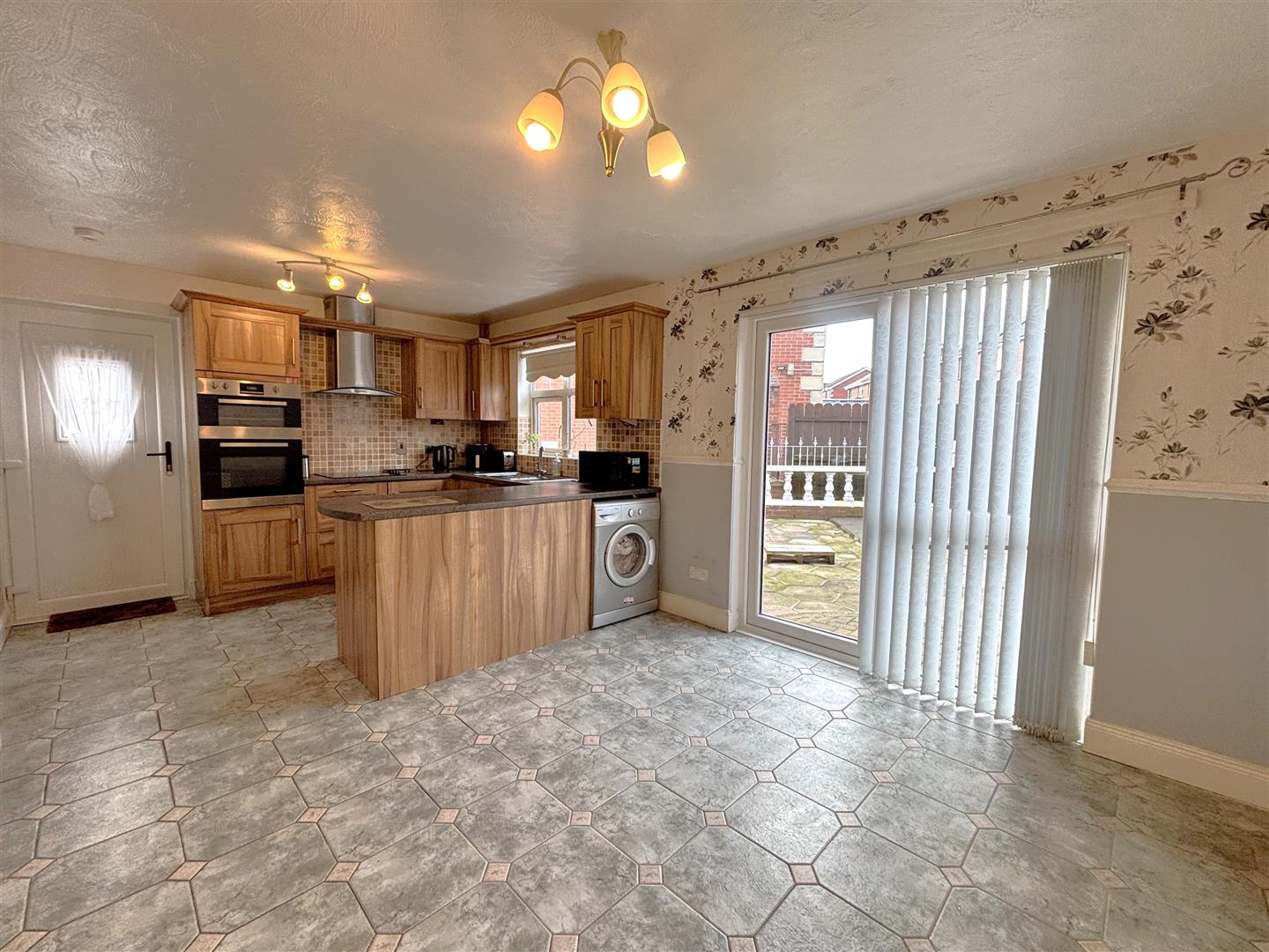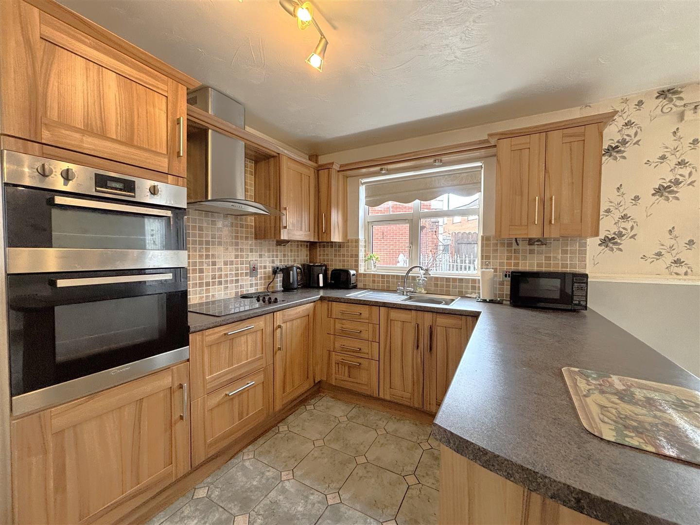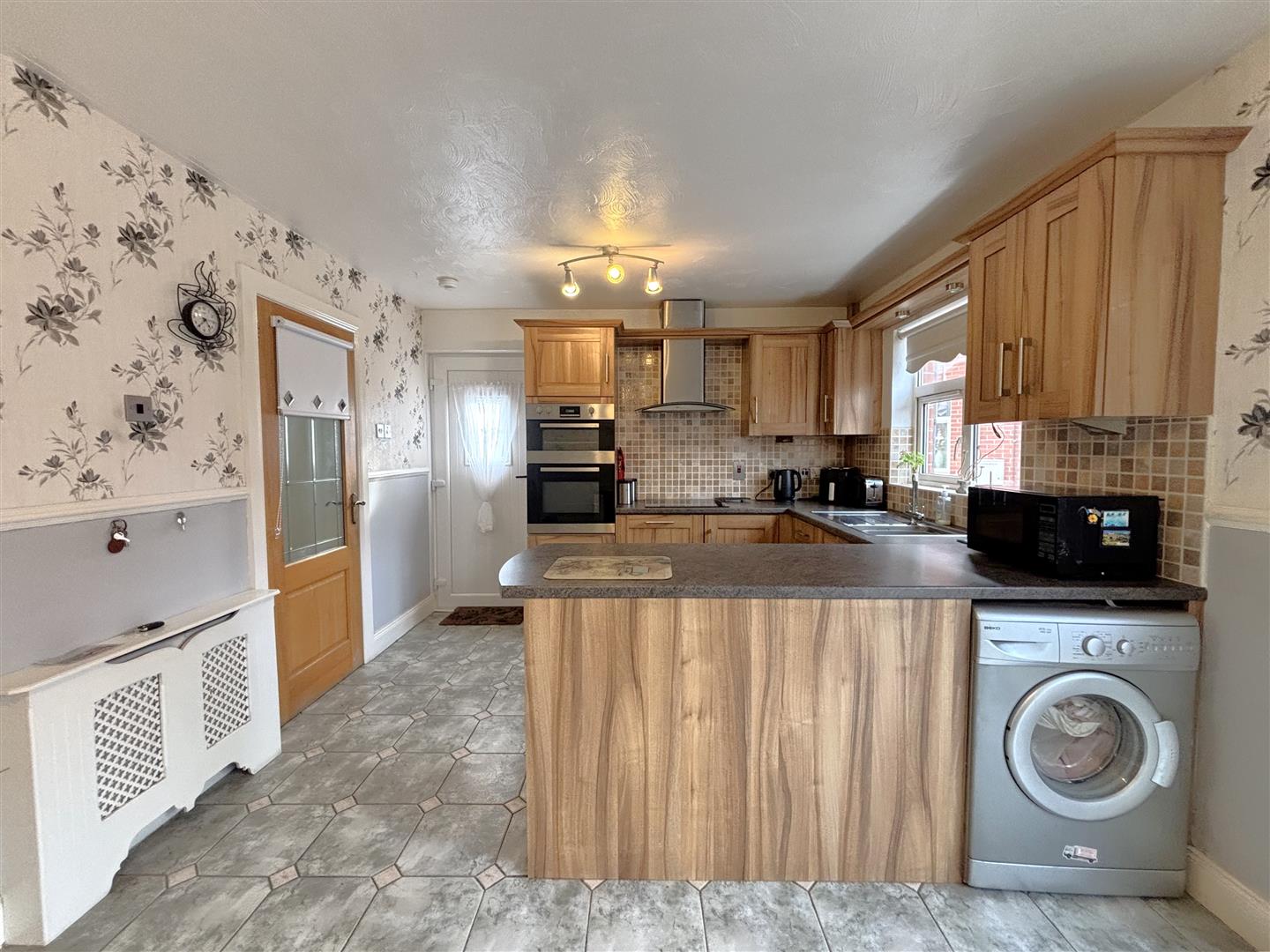 Single drainer stainless steel sink unit, range of high and low level units, formica worktops, built-in high level double oven, ceramic hob, stainless steel canopy extractor fan, integrated under fridge and freezer, plumbed for washing machine, partly tiled walls, ceramic tiled floor, panelled radiator, uPvc door to side.