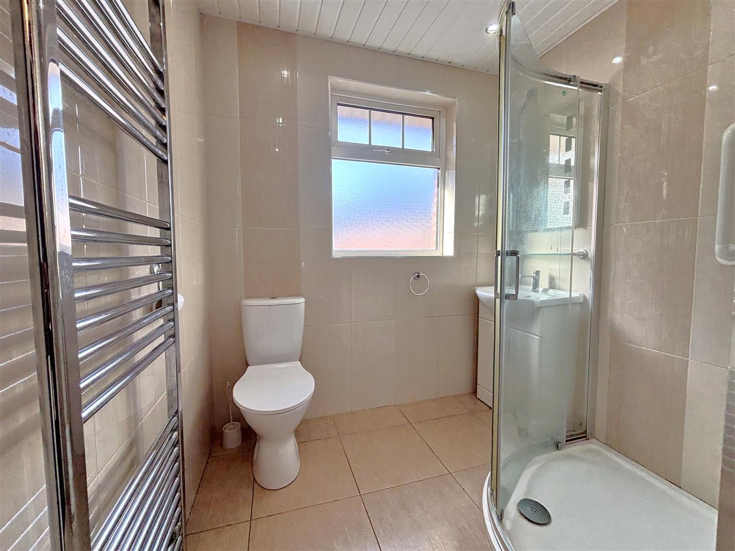 Modern white bathroom suite with chrome fitments comprising shower cubicle, electric shower, vanity unit, low flush wc, featured radiator, fully tiled walls, pvc ceiling, recessed lighting.