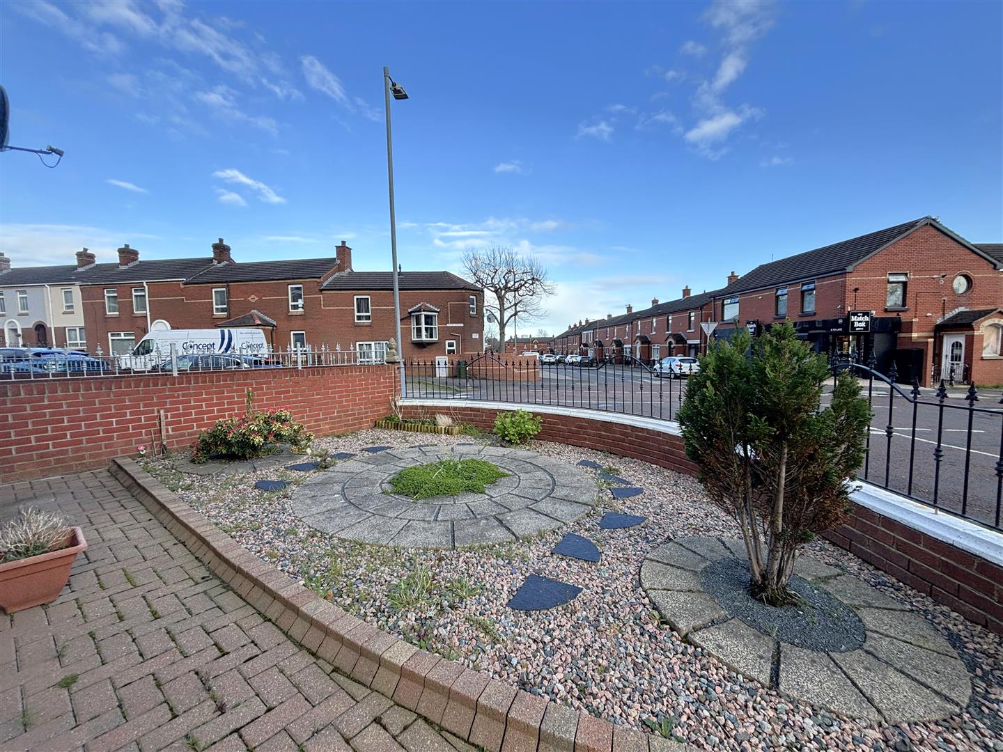 Hard landscaped garden front, side and rear in brick pavers, stone chippings, flowerbeds and shrubs. Off street carparking, outside tap and light.