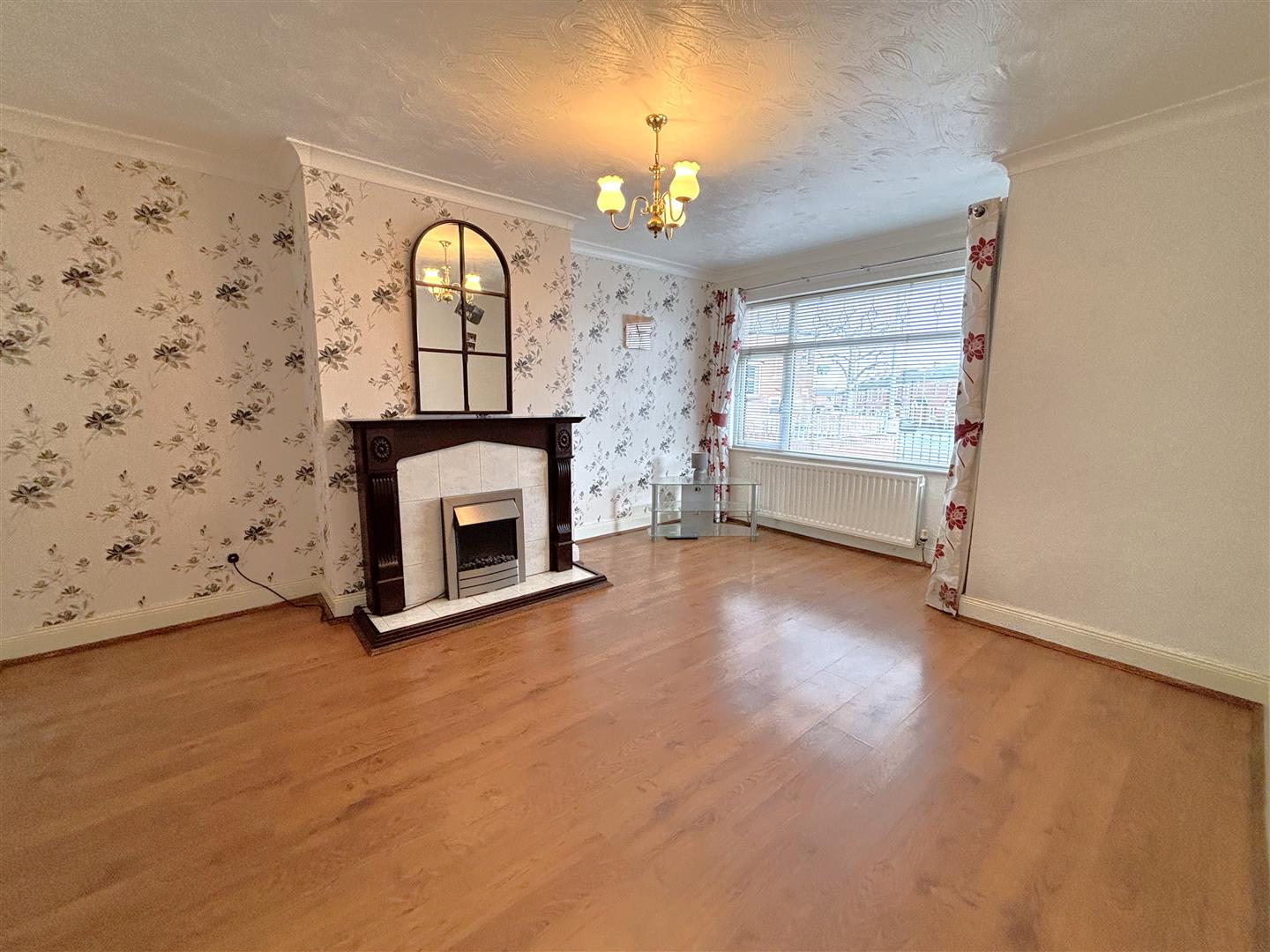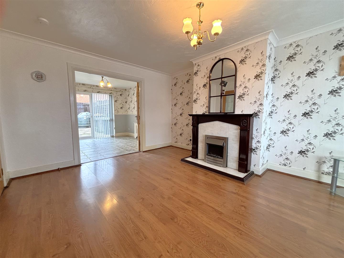 Classic fireplace with tiled inset and wooden hearth, wood laminate floor, double panelled radiator, double doors to dining