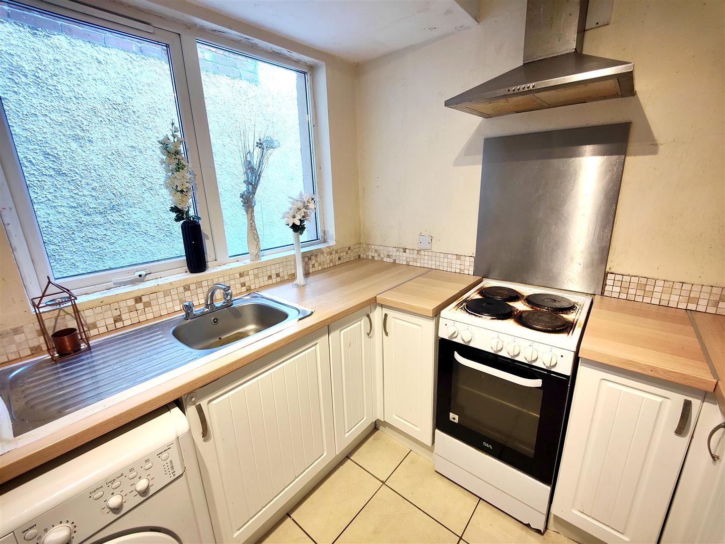 Single drainer stainless steel sink unit, extensive range of high and low level units, formica worktops, cooker space, stainless steel splashback, stainless steel canopy extractor fan, fridge/freezer space, plumbed for washing machine, partly tiled walls, ceramic tiled floor, double panelled radiator, hardwood door to rear.