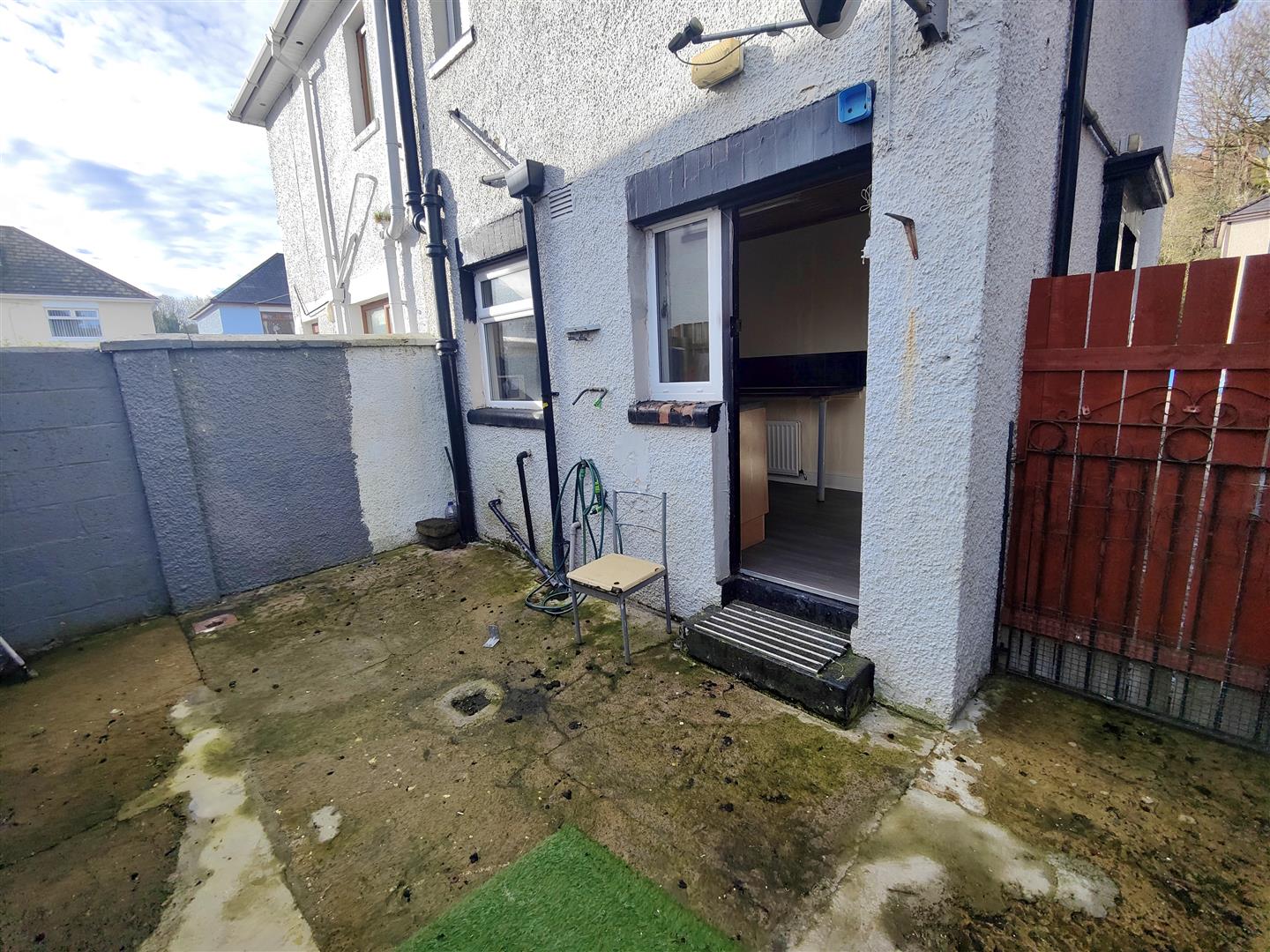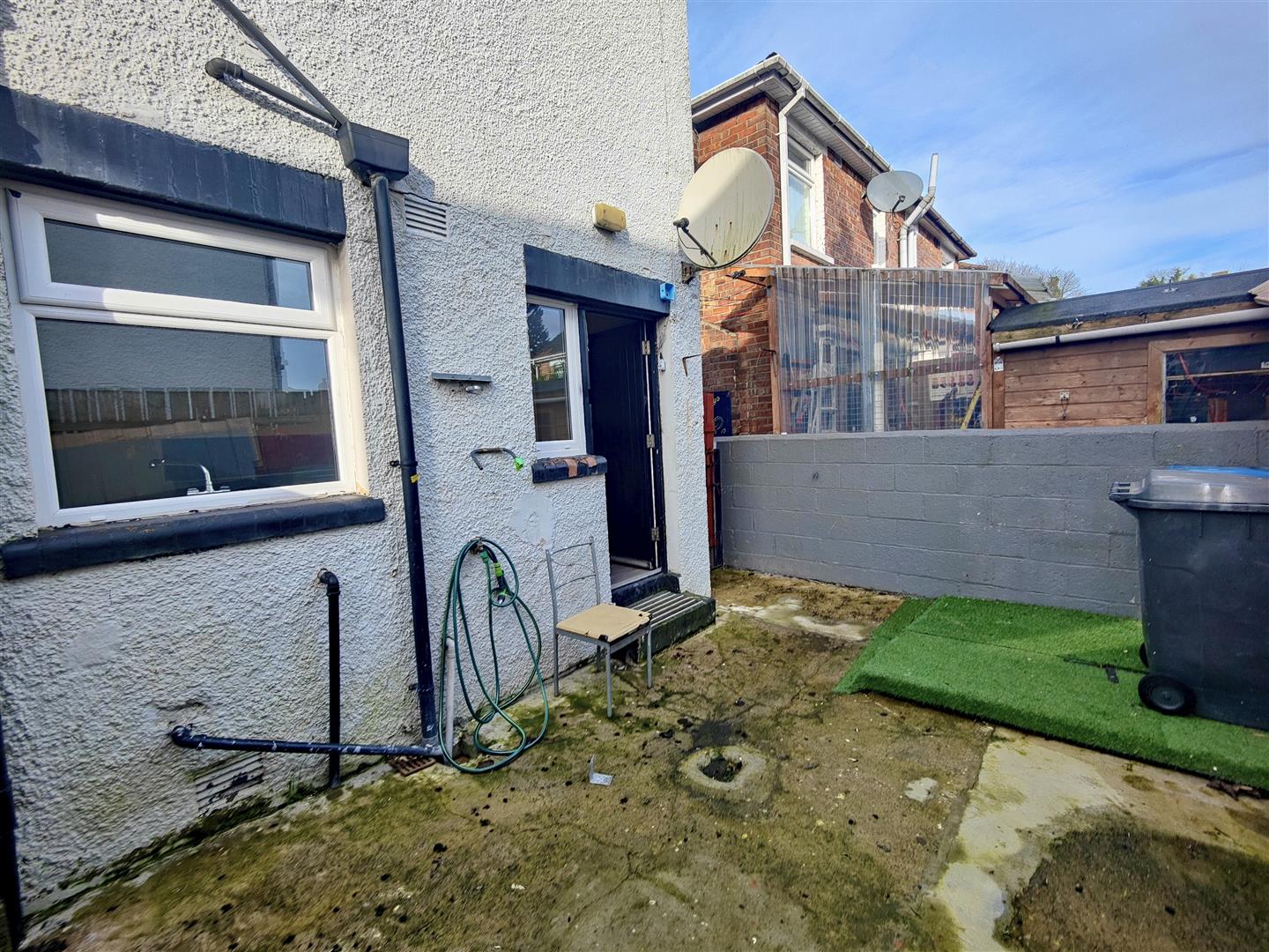Hard landscaped front and rear, shrubs, outside light and tap.