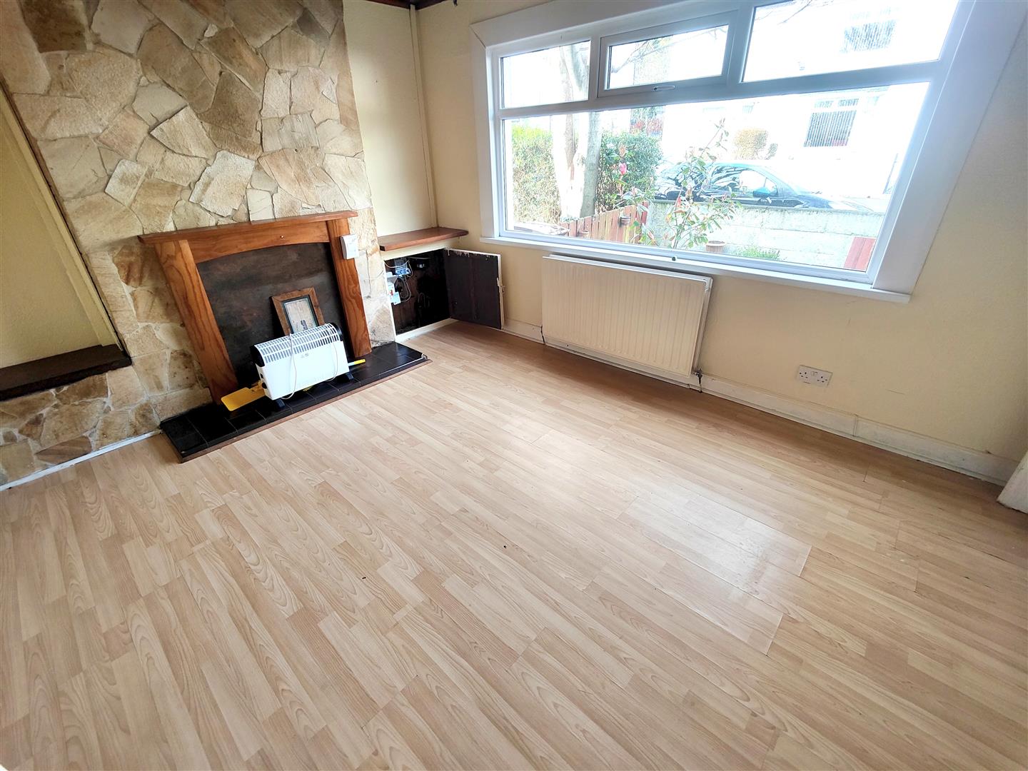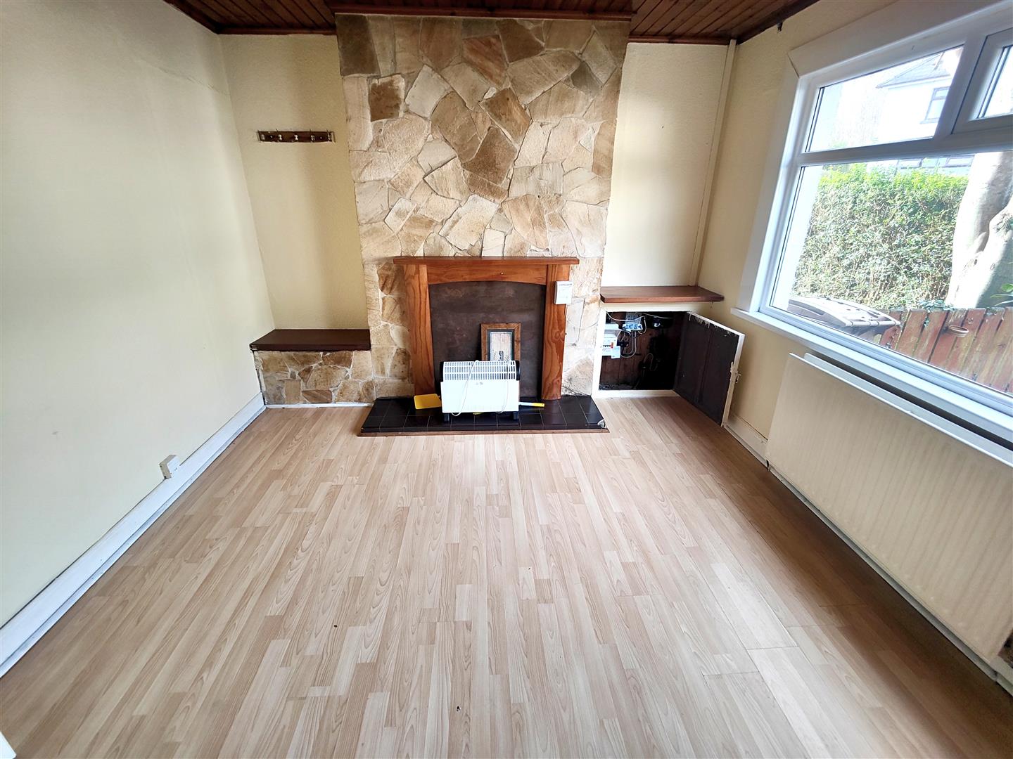 Wooden surround with tiled hearth, wood laminate floor, pine tongue and groove ceiling, double panelled radiator.
