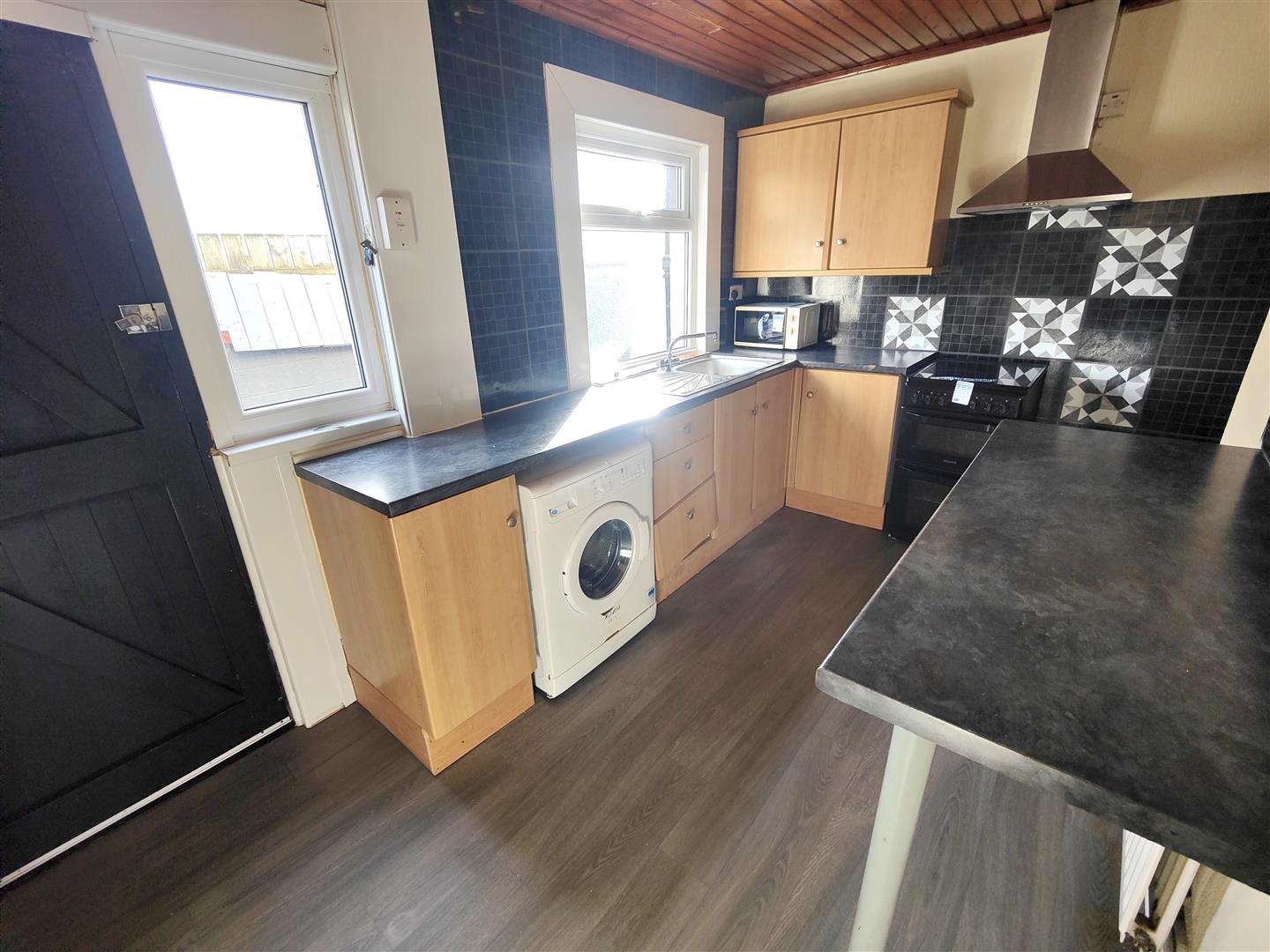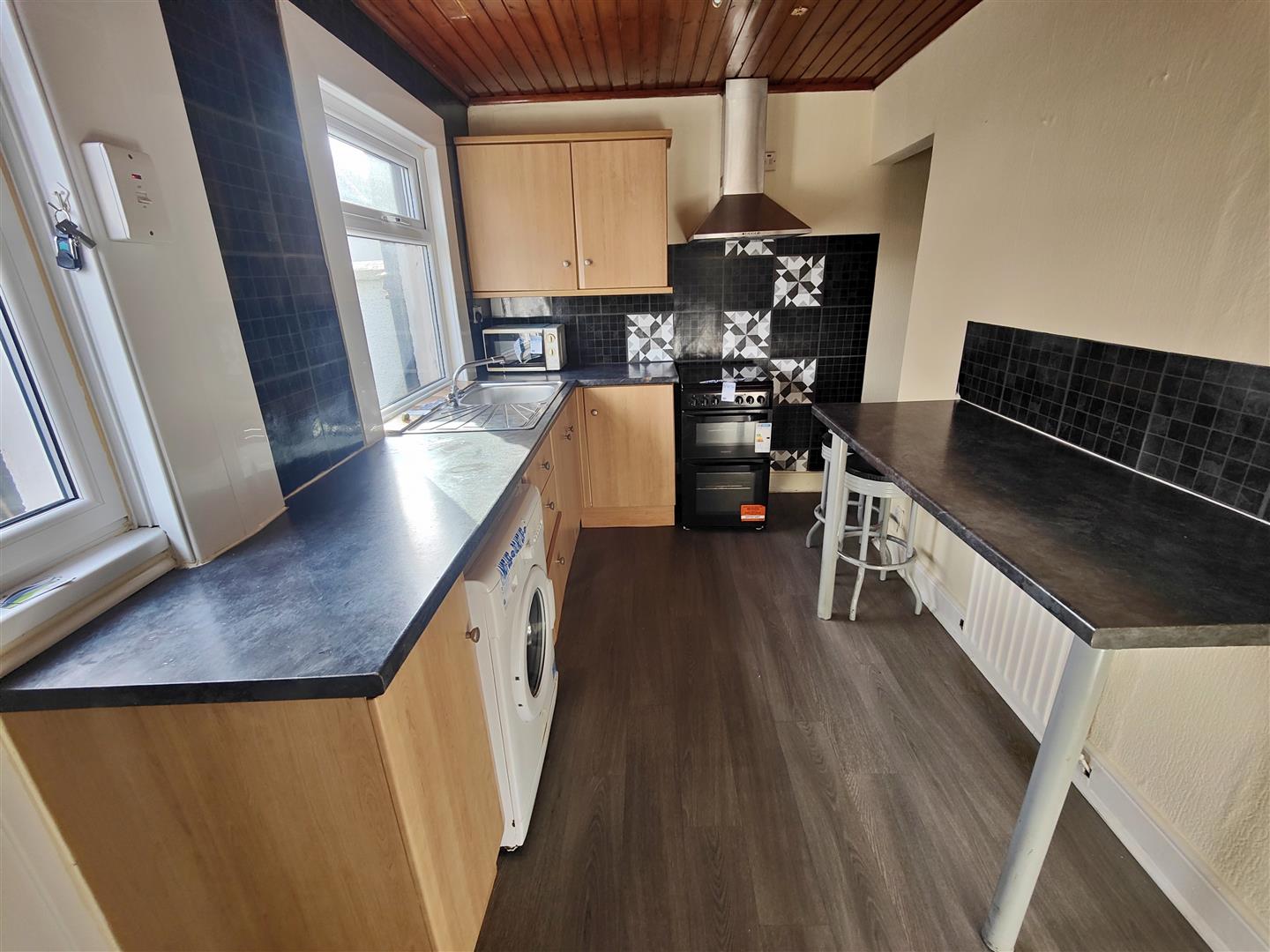 Single drainer stainless steel sink unit, range of high and low level units, formica worktops, breakfast bar, cooker space, stainless steel canopy extractor fan, fridge/freezer space, plumbed for washing machine, under stairs storage, double panelled radiator, hardwood rear door.