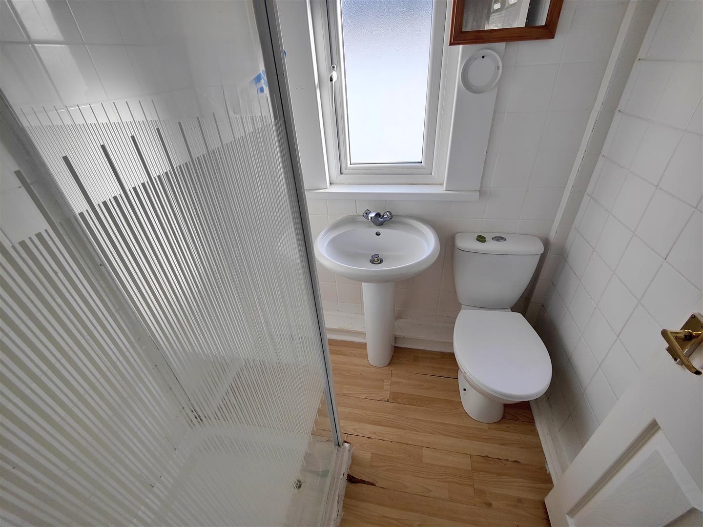 Fully tiled classic white suite comprising shower cubicle, thermostatically controlled telephone handset shower unit, pedestal wash hand basin, low flush wc, tiled walls, wood laminate floor.