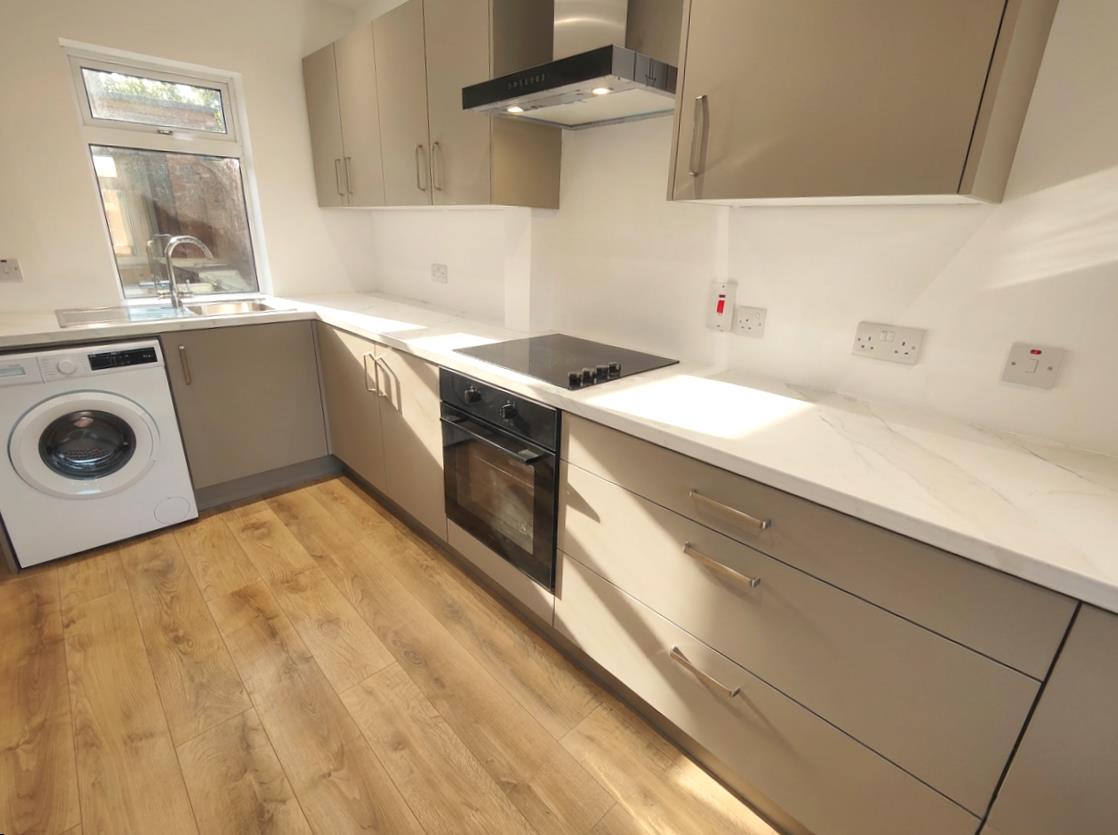 Bowl and a half stainless steel single drainer sink unit, excellent range of luxury high and low level units, granite effect formica work surfaces, built-in high level oven and ceramic hob, stainless steel canopy style extractor fan, fridge freezer space, plumbed for washing machine, concealed gas boiler, partially tiled walls, recessed lighting, wood laminate floor, built-in cupboard, double panelled radiator.