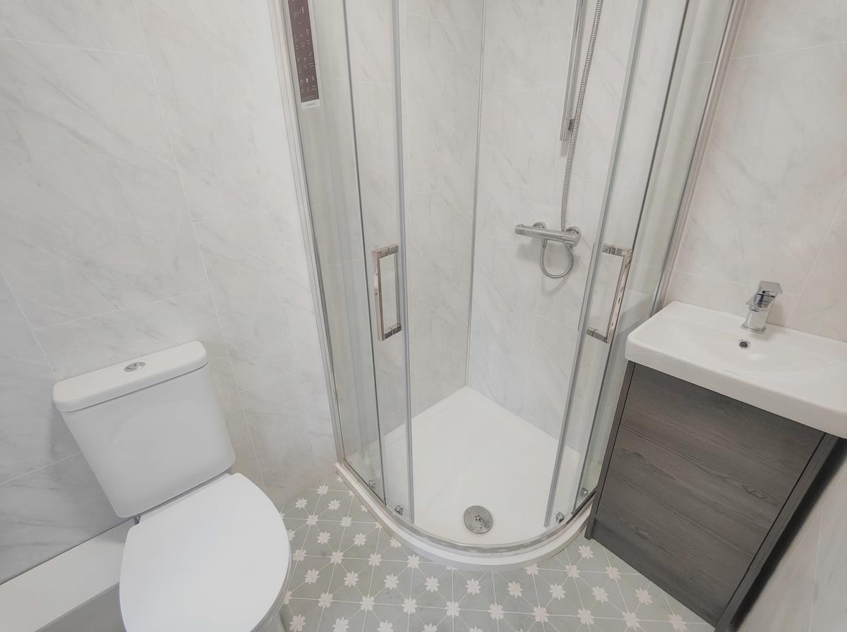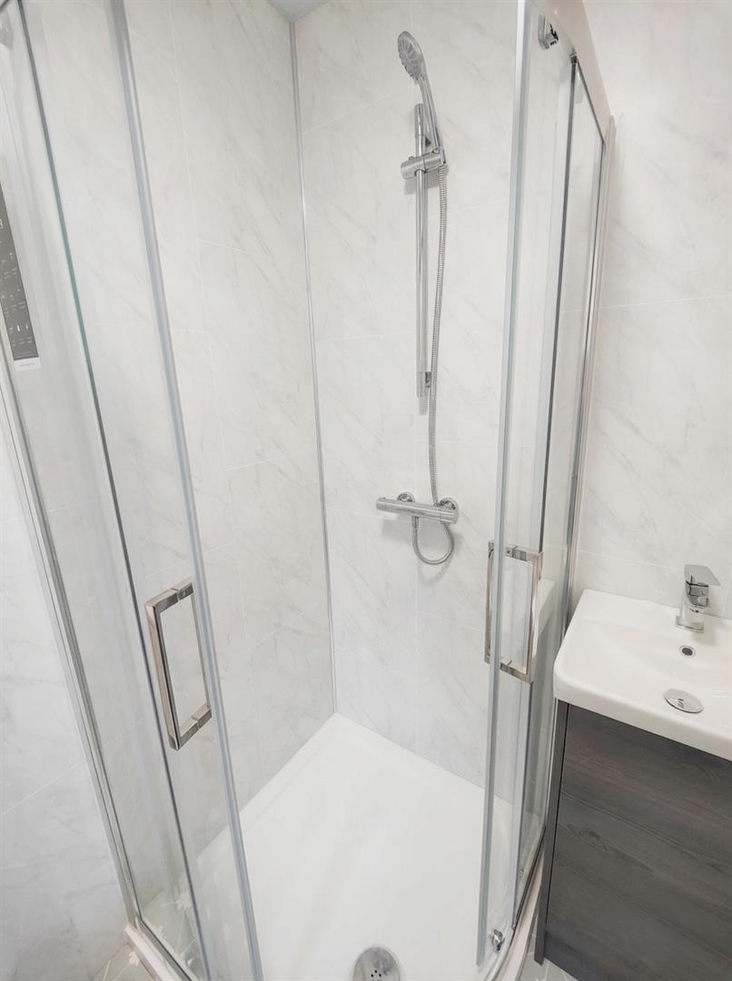 Luxury white suite comprising shower cubicle, thermostatically controlled drench style telephone handset shower, vanity unit, low flush wc, double panelled radiator, pvc panelled walls and ceiling, extractor, ceramic tiled floor.