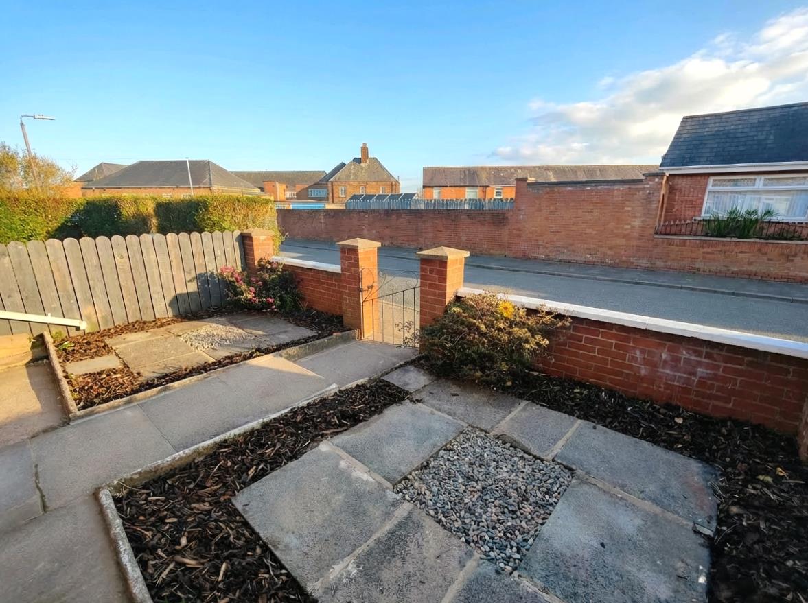 Hard landscaped gardens to front in patio and flower beds. Private gardens to rear in mature lawn.