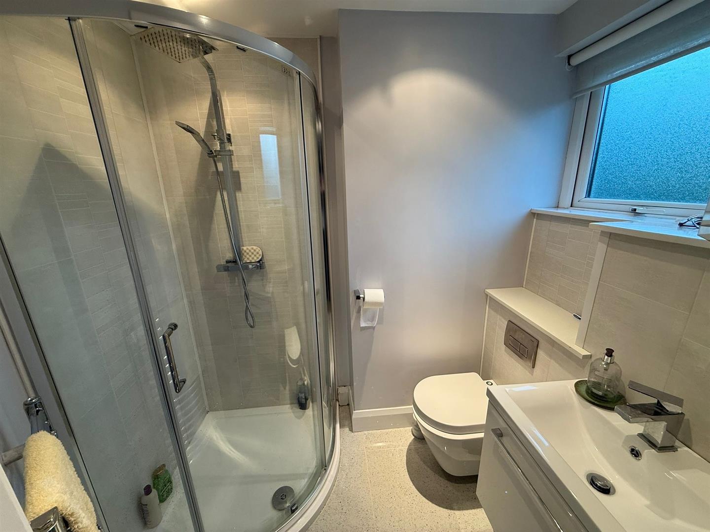 White suite comprising low flush W.C, wash hand basin with built in storage, enclosed shower, heated towel rail, tile cladded walls and tiled flooring.