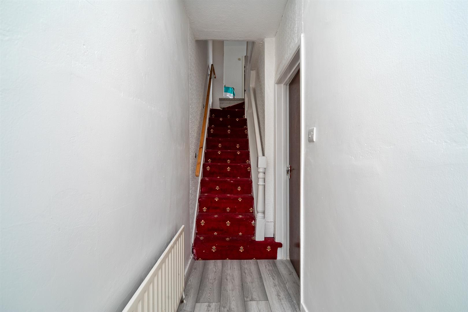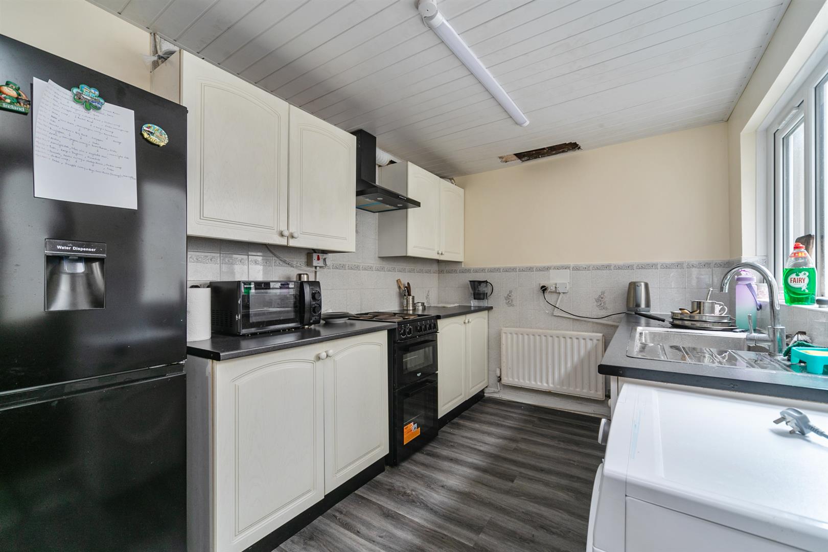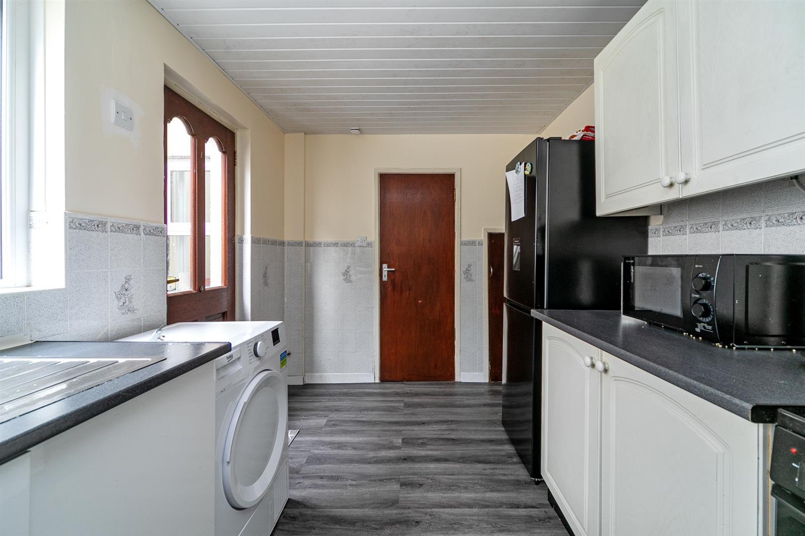 Range of high and low level units, stainless steel sink unit with drainer, plumbed for washing machine, part tiled walls and vinyl flooring. Under stairs storage.