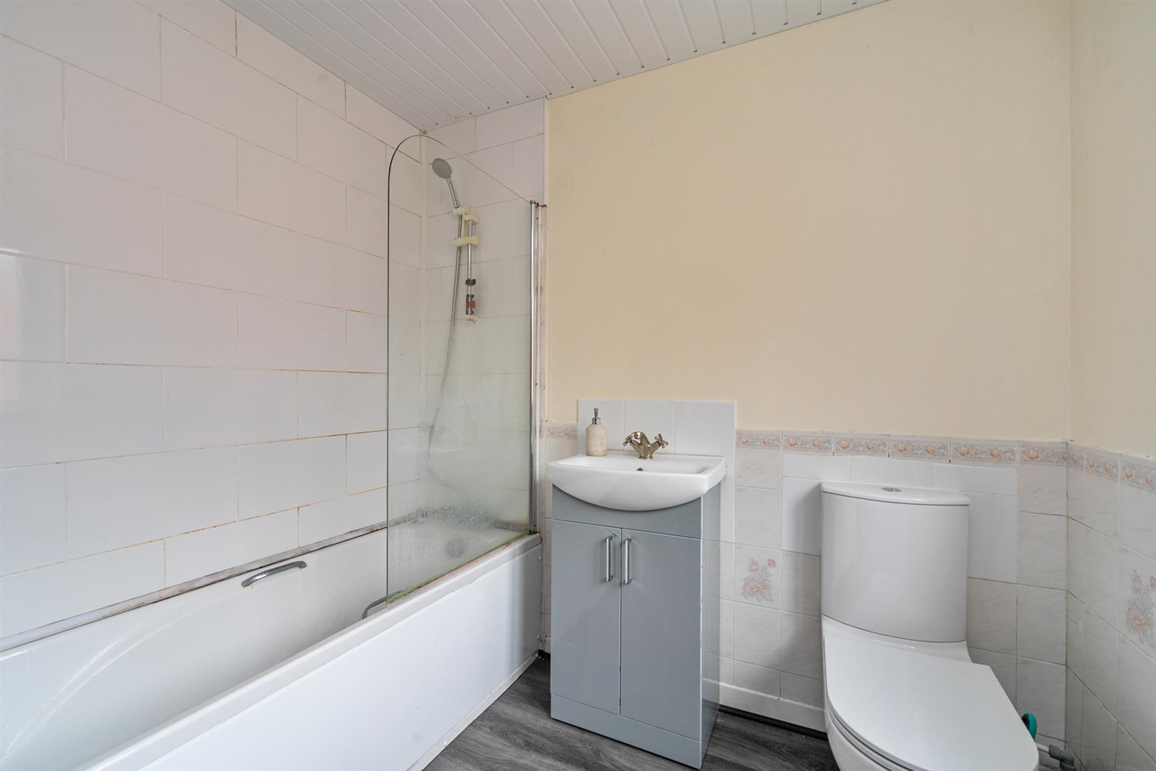 Low flush W.C, wash hand basin with built in vanity unit, panel bath, part tiled walls and vinyl flooring. Built in storage.