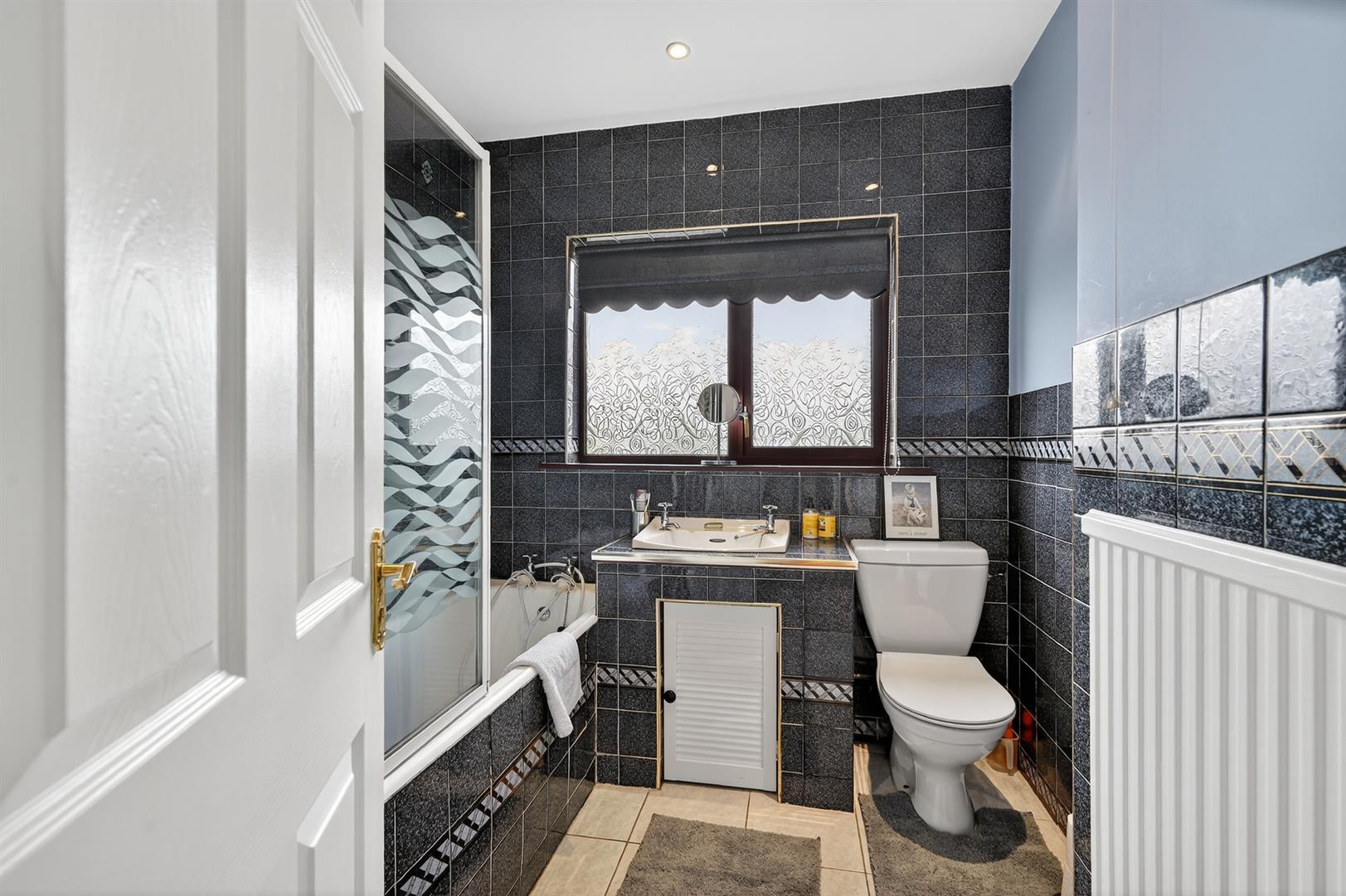 Comprising tiled bath with shower over, wash hand basin with storage below, low flush W.C, part tiled walls, tiled floor, recessed spotlighting.
