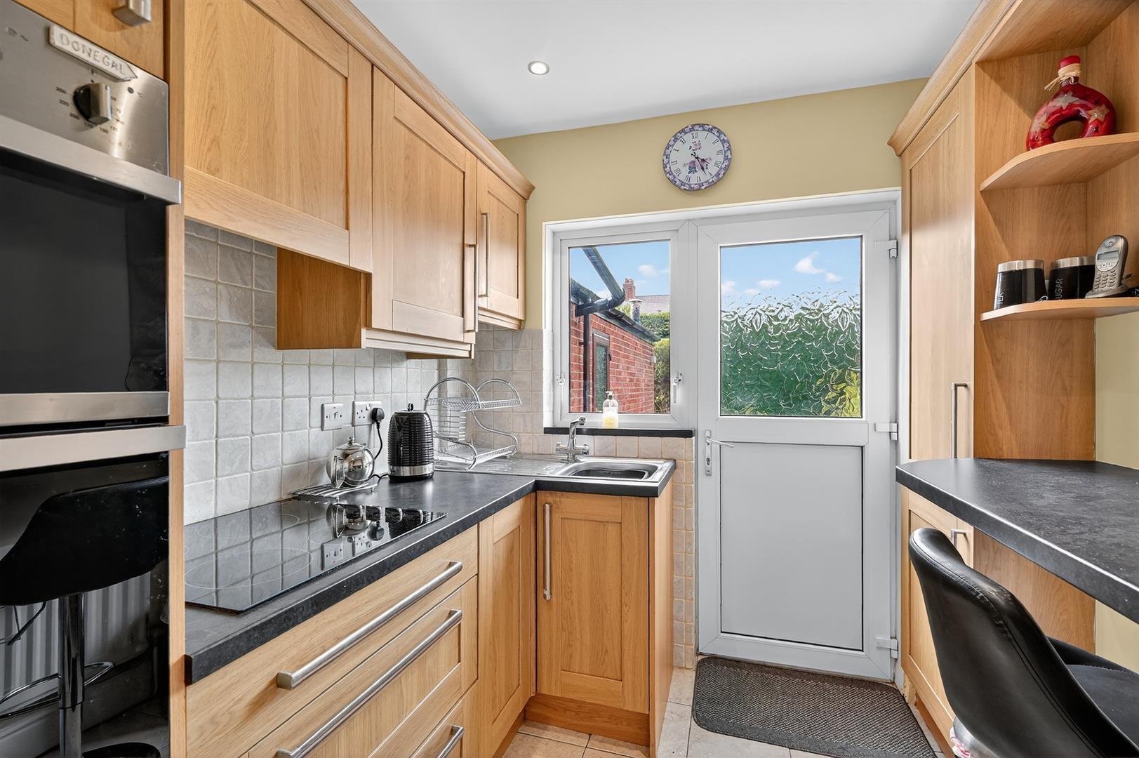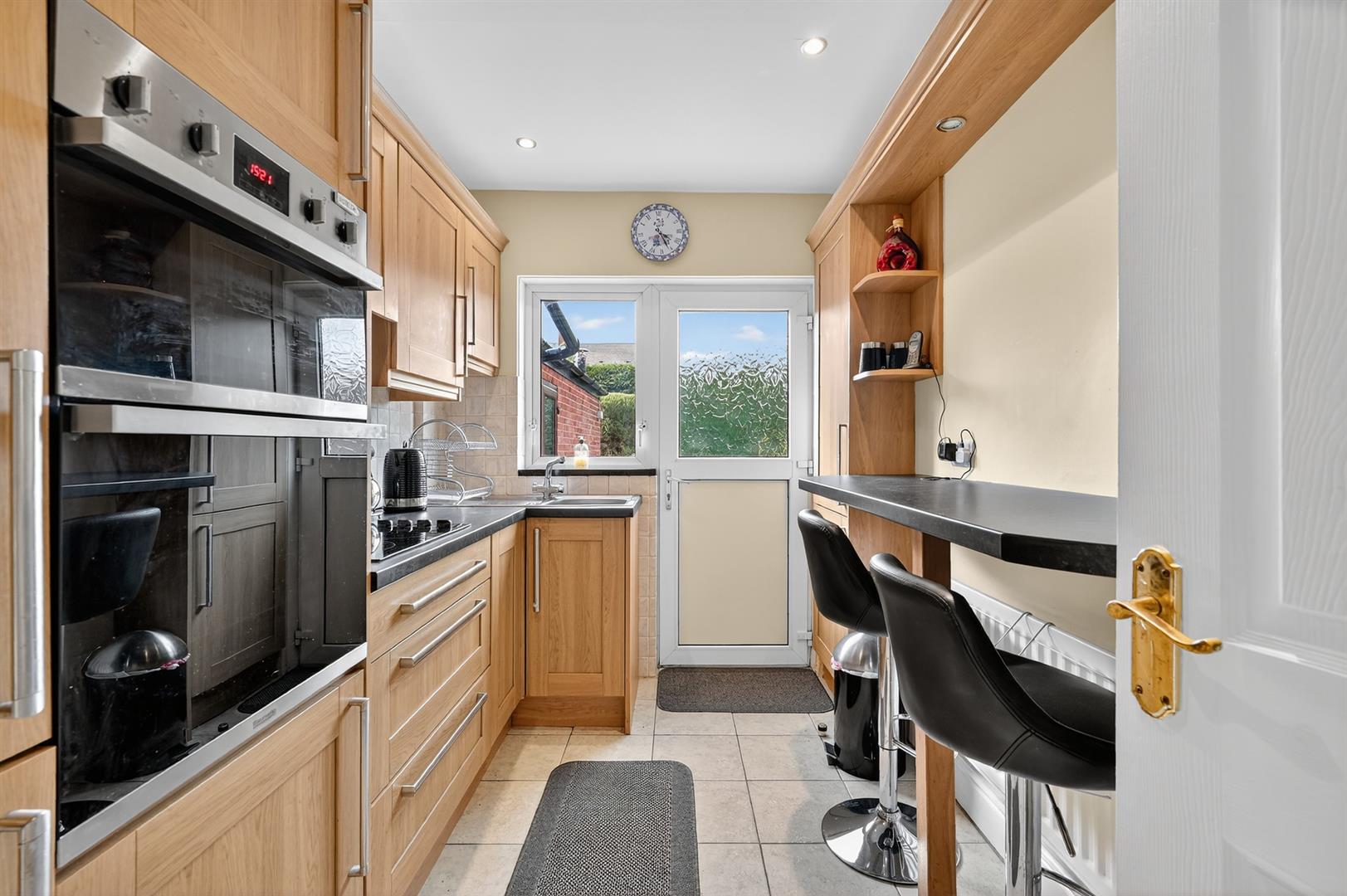 Range of high and low level units, wall mounted double oven, 4 ring hob, extractor fan, breakfast bar, single drainer steel sink unit with mixer tap, part tiled walls, tiled floor.