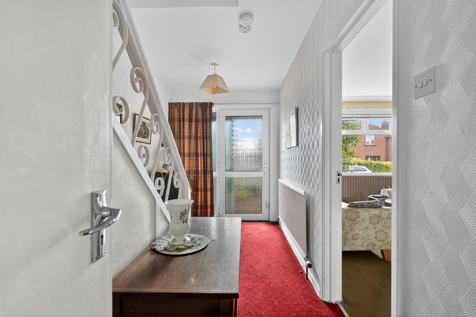 Sliding patio doors to entrance porch. Glass panelled PVC front door. Storage under stairs.