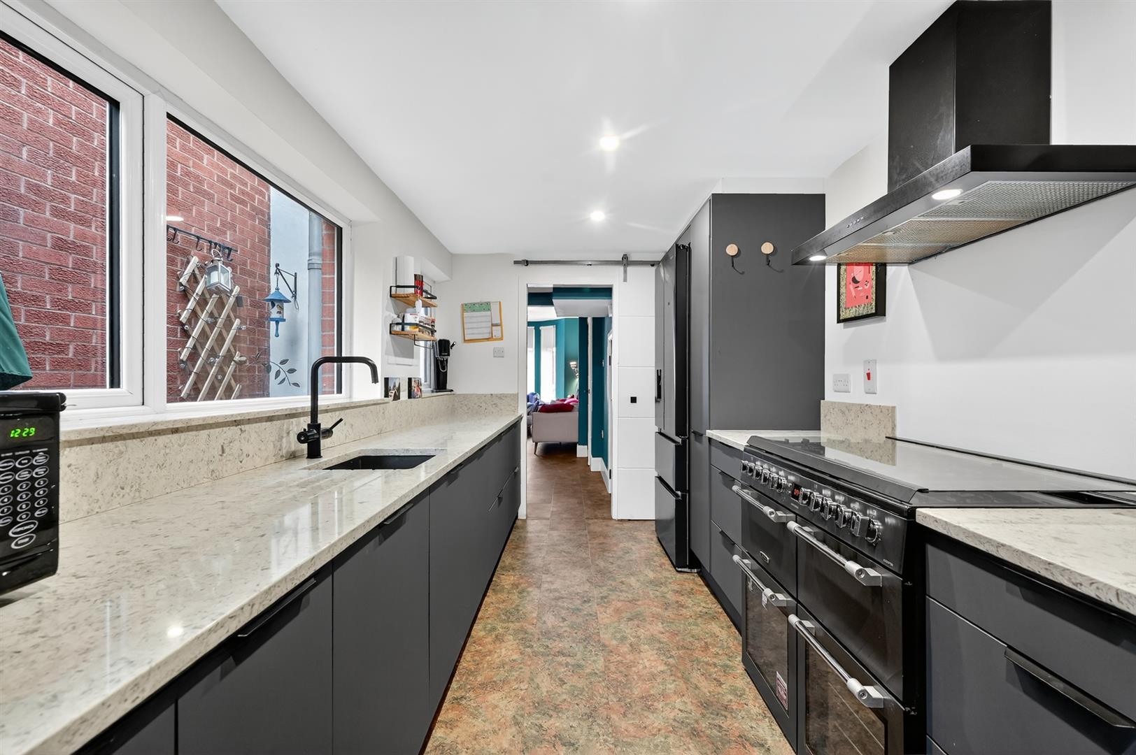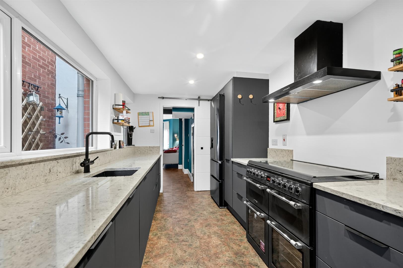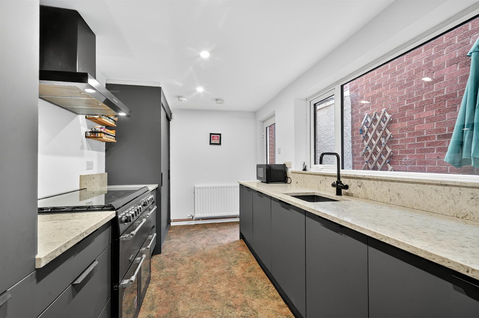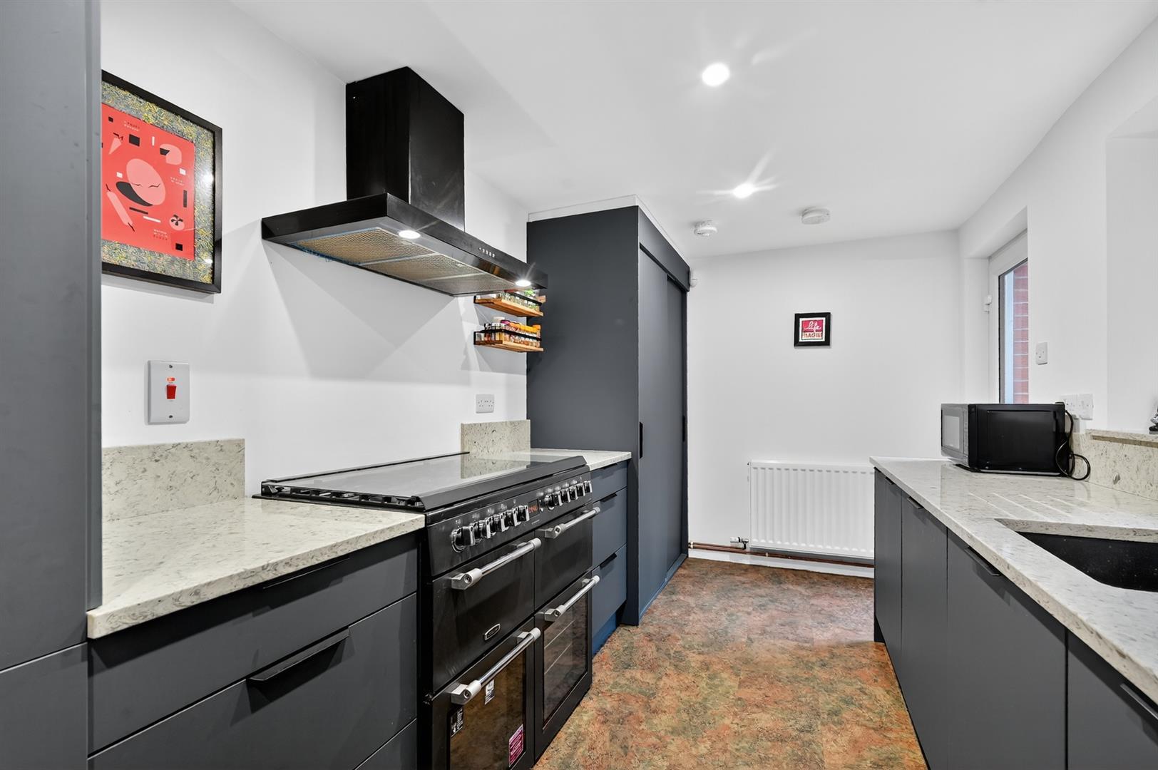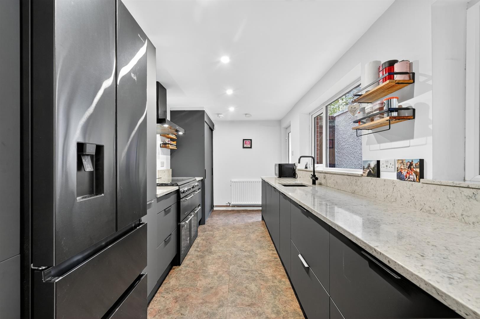Contemporary fitted kitchen with excellent range of high and low level units, integrated washing machine & dishwasher, sink with mixer tap.