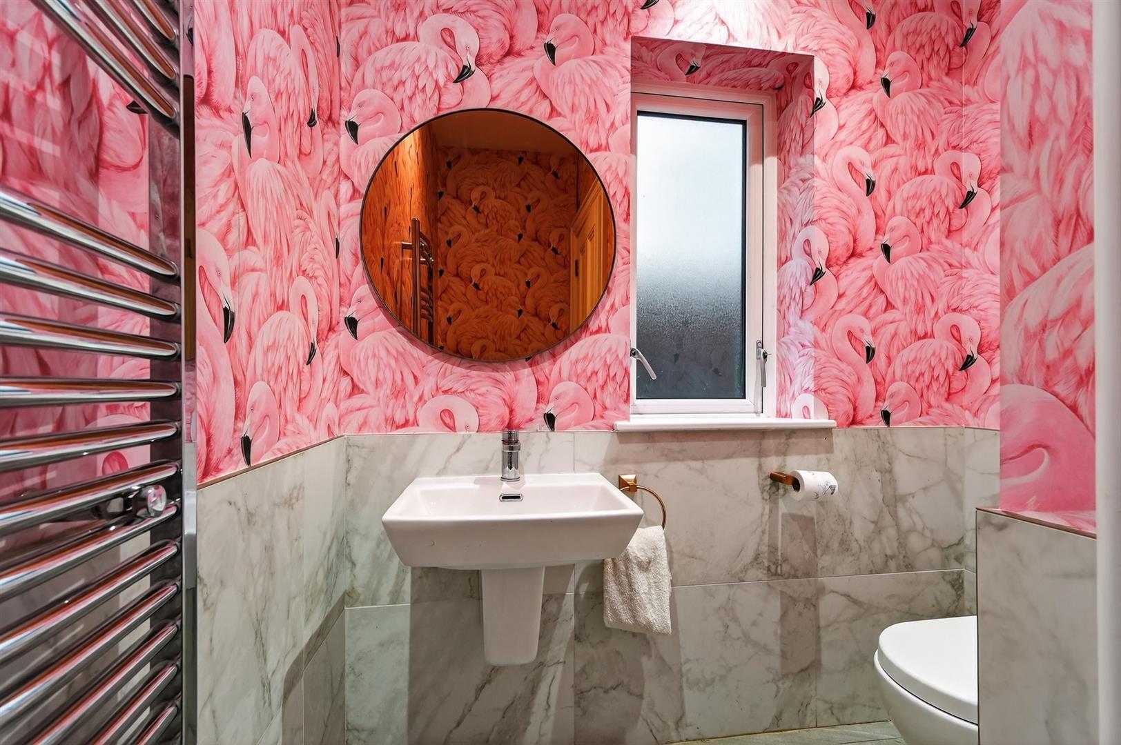 Low flush W.C, wall hung wash hand basin, part tiled walls, tiled flooring.