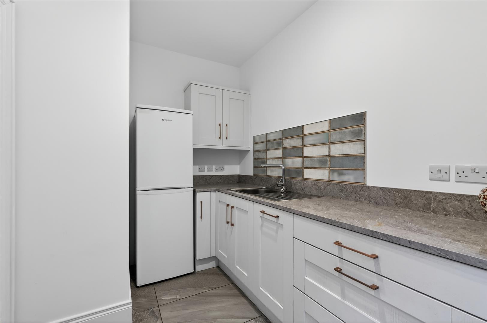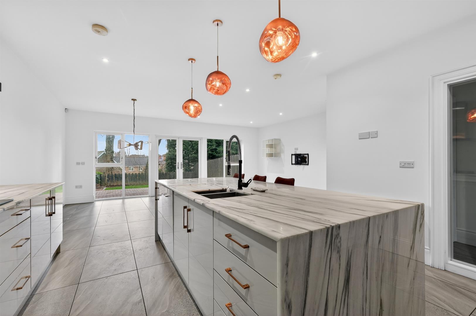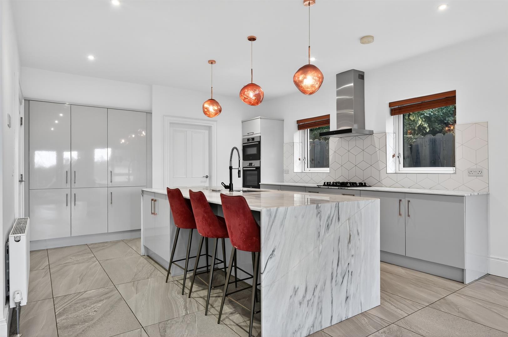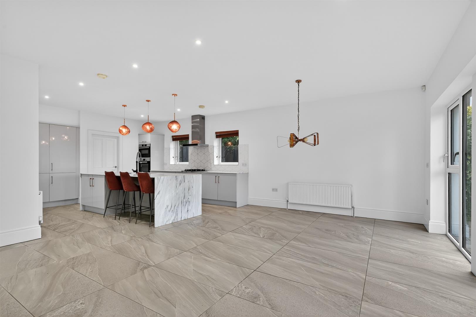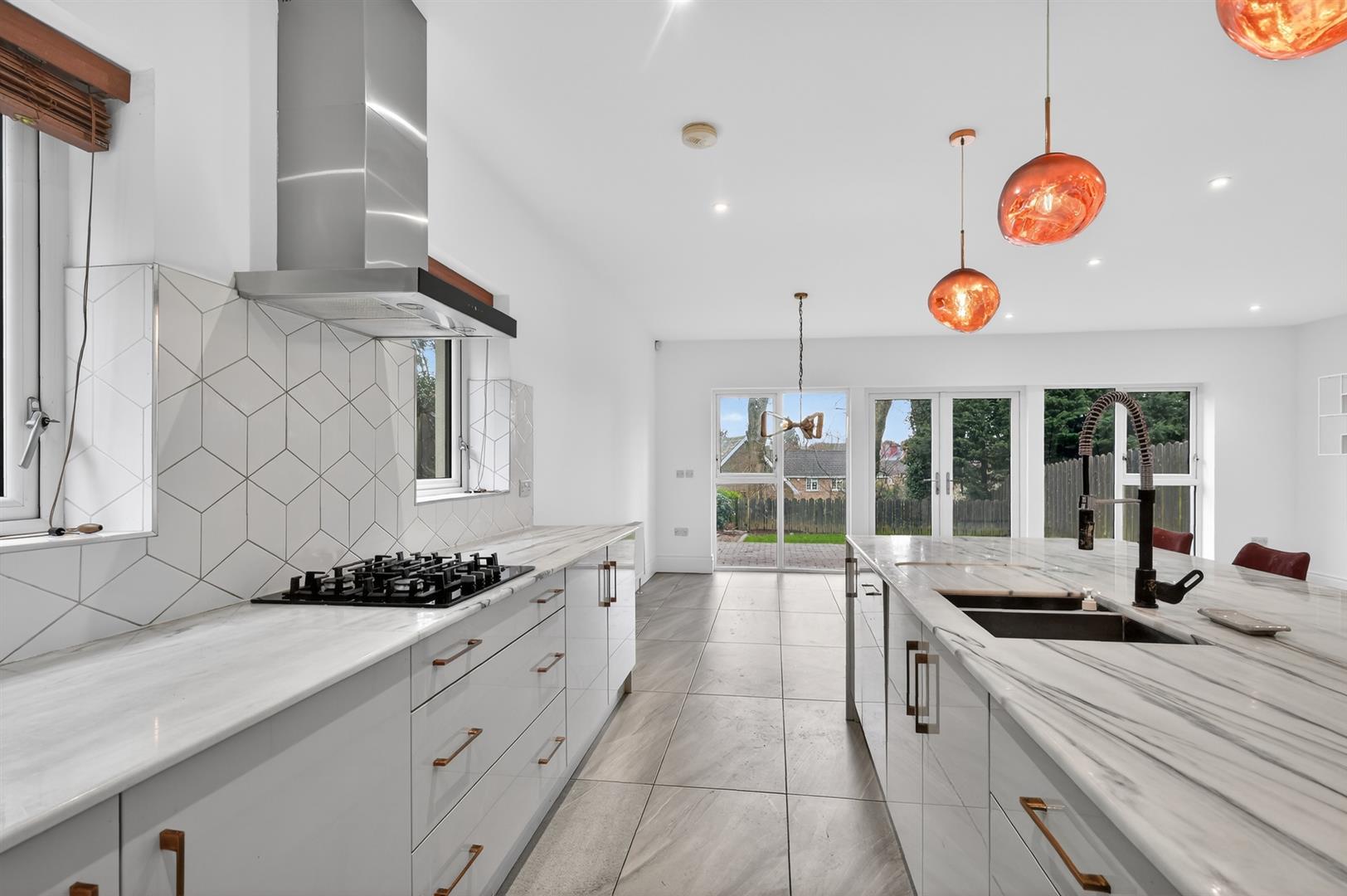 High quality contemporary units, `Sinquastone´ re-engineered quartz worktops, integrated appliances to include gas hob, electric oven & microwave oven combi, integrated fridge freezer, dishwasher & extractor, island. Double doors leading to enclosed garden.