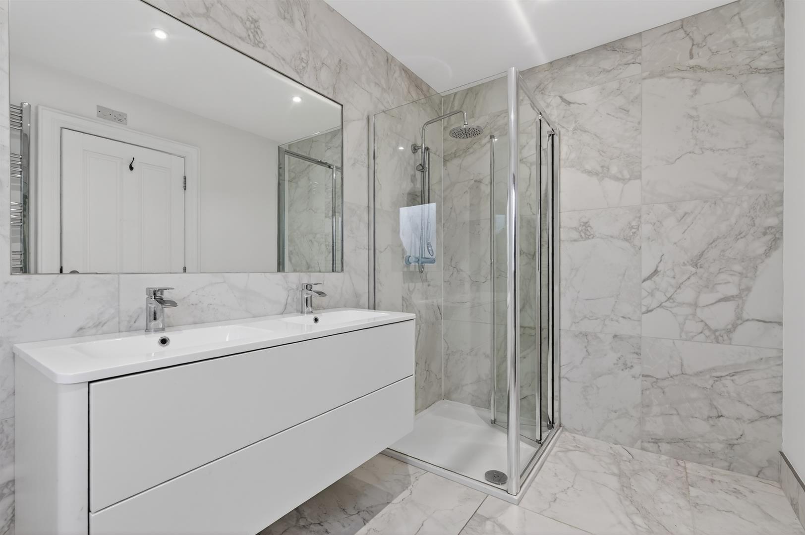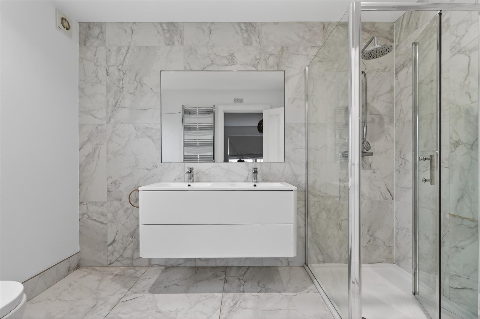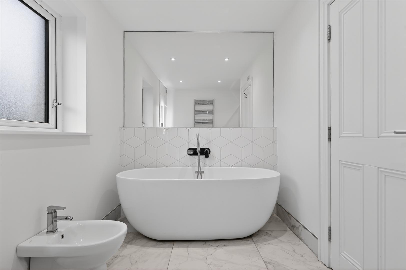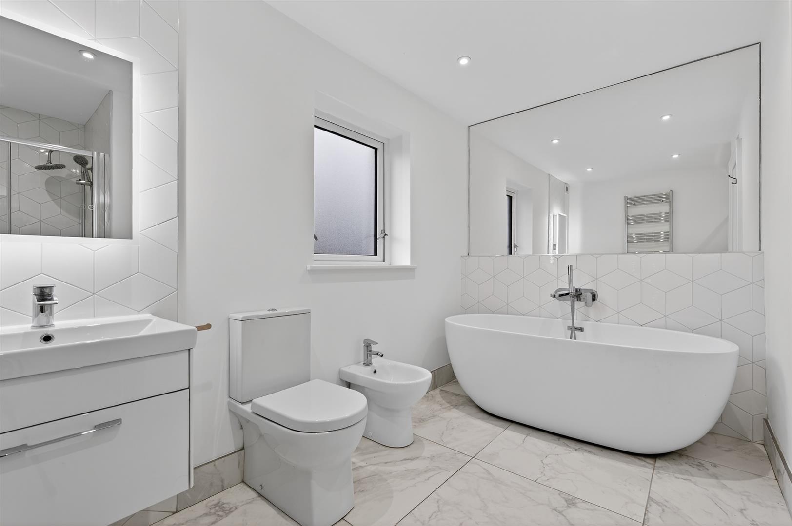 Contemporary suite with free standing bath, walk in thermostatic shower with dual head, wall mounted vanity unit. LED illuminated mirror with de-mister pad with Bluetooth speaker, heated chrome towel radiator, wall to wall feature mirror.