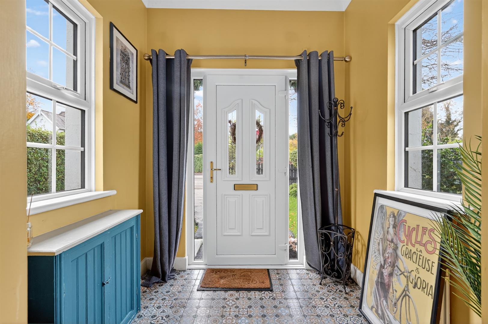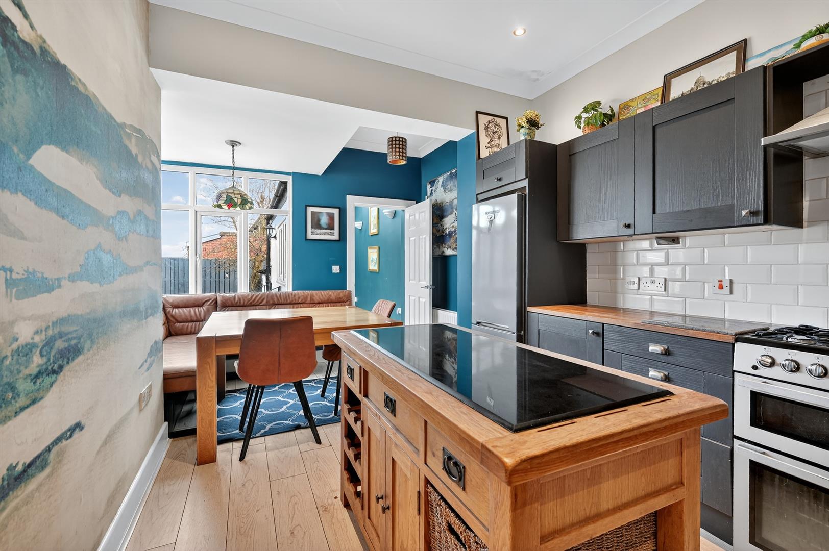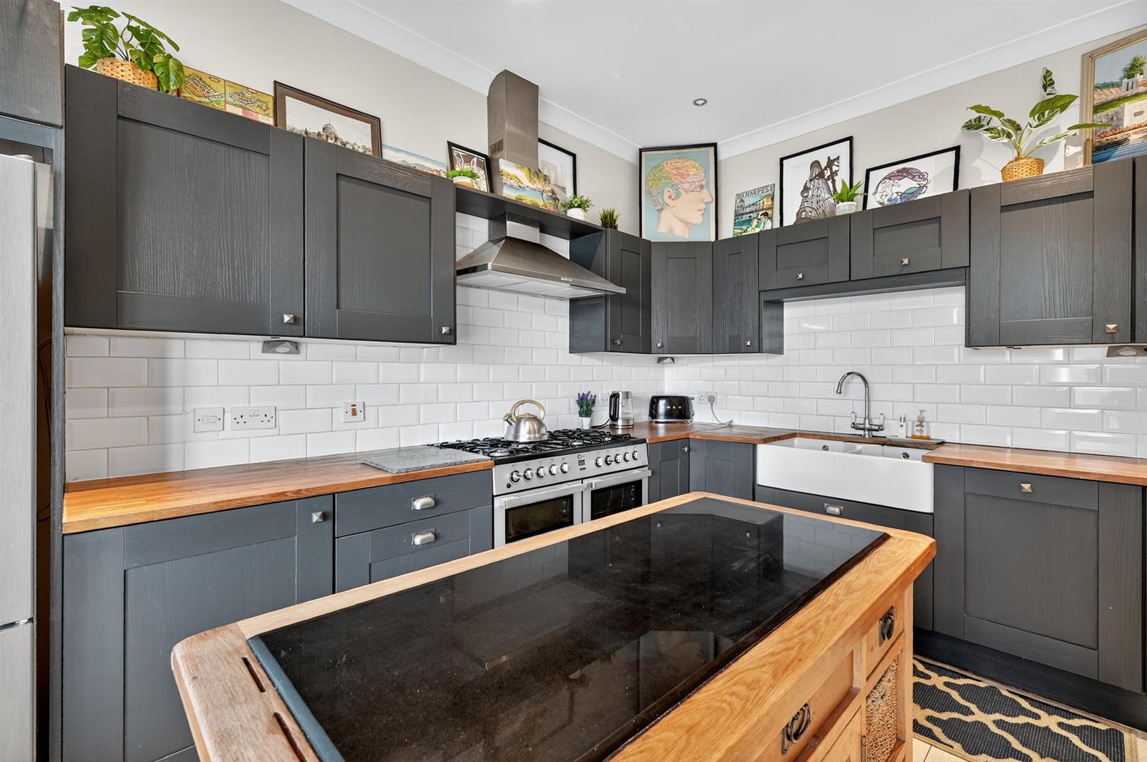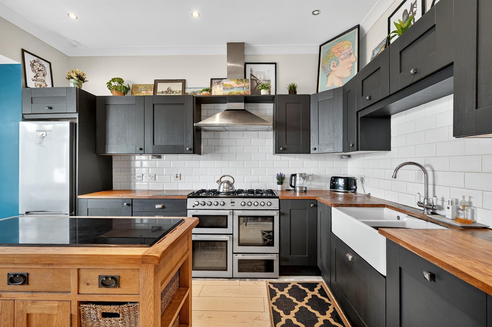 Beautifully fitted kitchen with range of high and low level units, integrated dishwasher, part tiled walls, double Belfast style sink, recessed spot lighting.