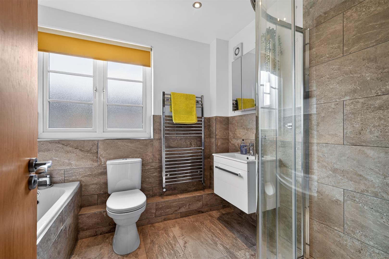 Contemporary suite comprising low flush W.C, panel bath, wash hand basin with vanity unit below, walk in shower, part tiled walls, tiled flooring, recessed spotlighting.
