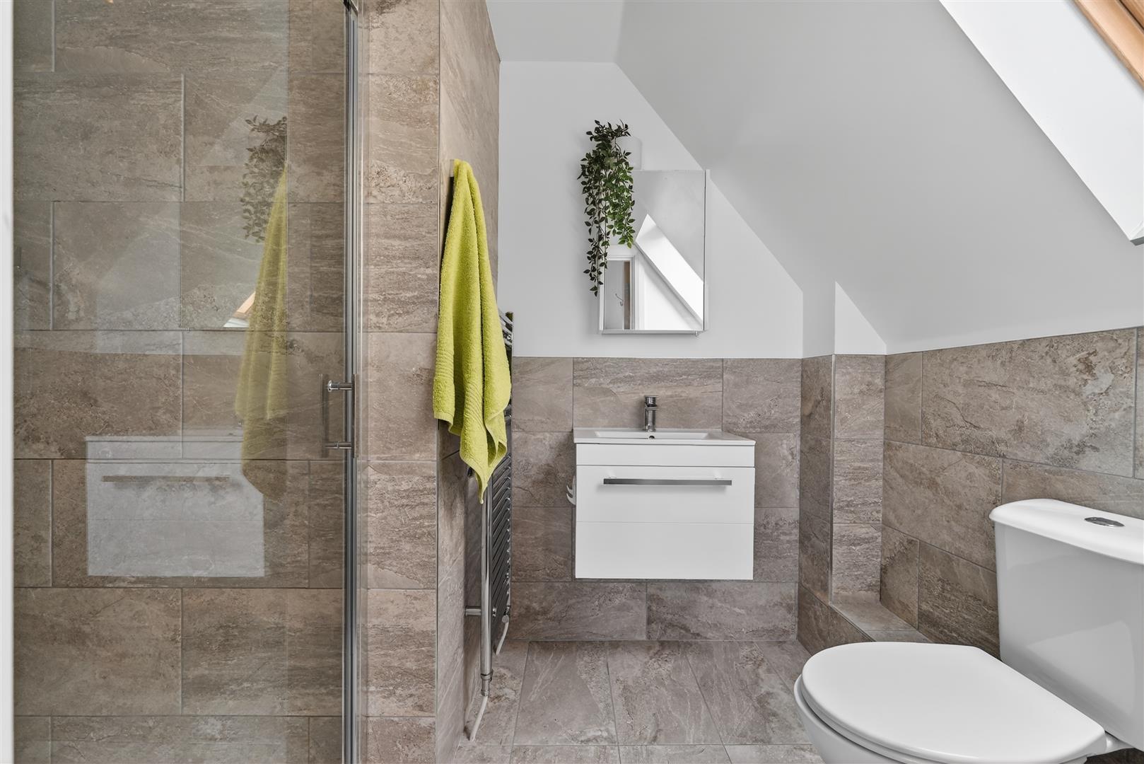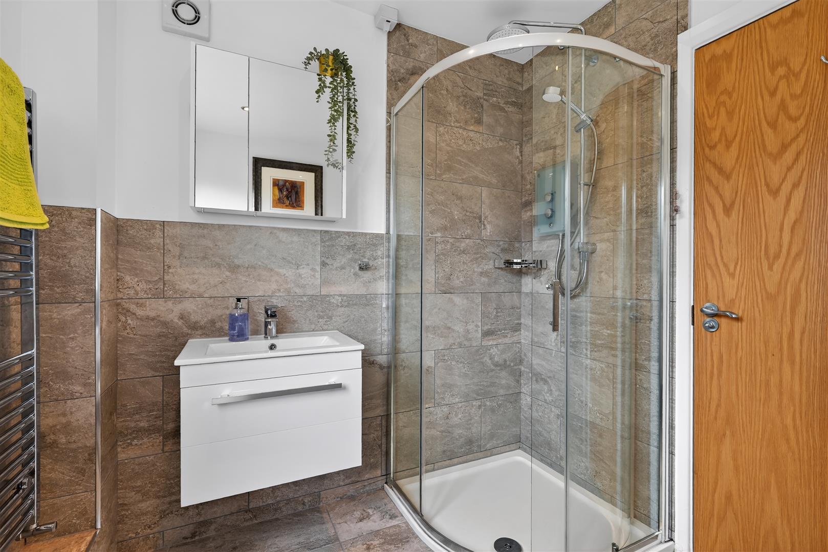 Contemporary suite comprising enclosed shower, low flush W.C, wash hand basin with vanity unit below, part tiled walls, tiled flooring.