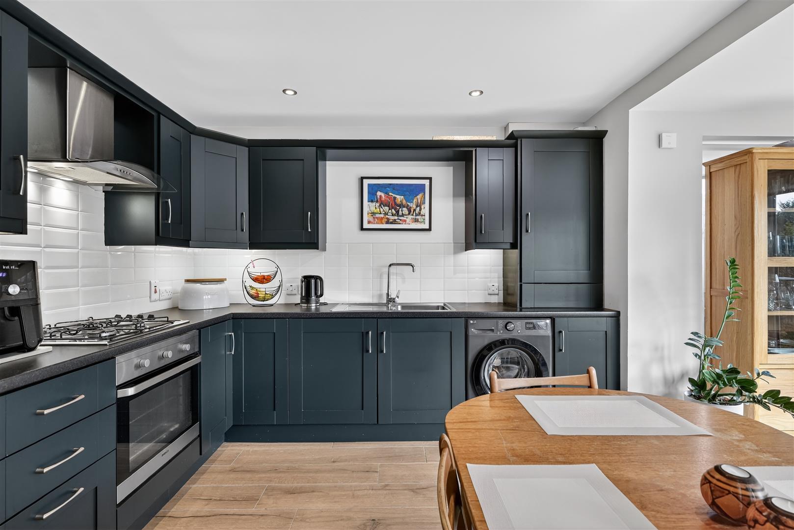 Range of high and low level units, plumbed for washing machine, integrated oven, 4 ring gas hob, stainless steel extractor fan, single drainer stainless steel sink unit with mixer tap, part tiled walls, recessed spotlighting, PVC double doors to enclosed rear garden.