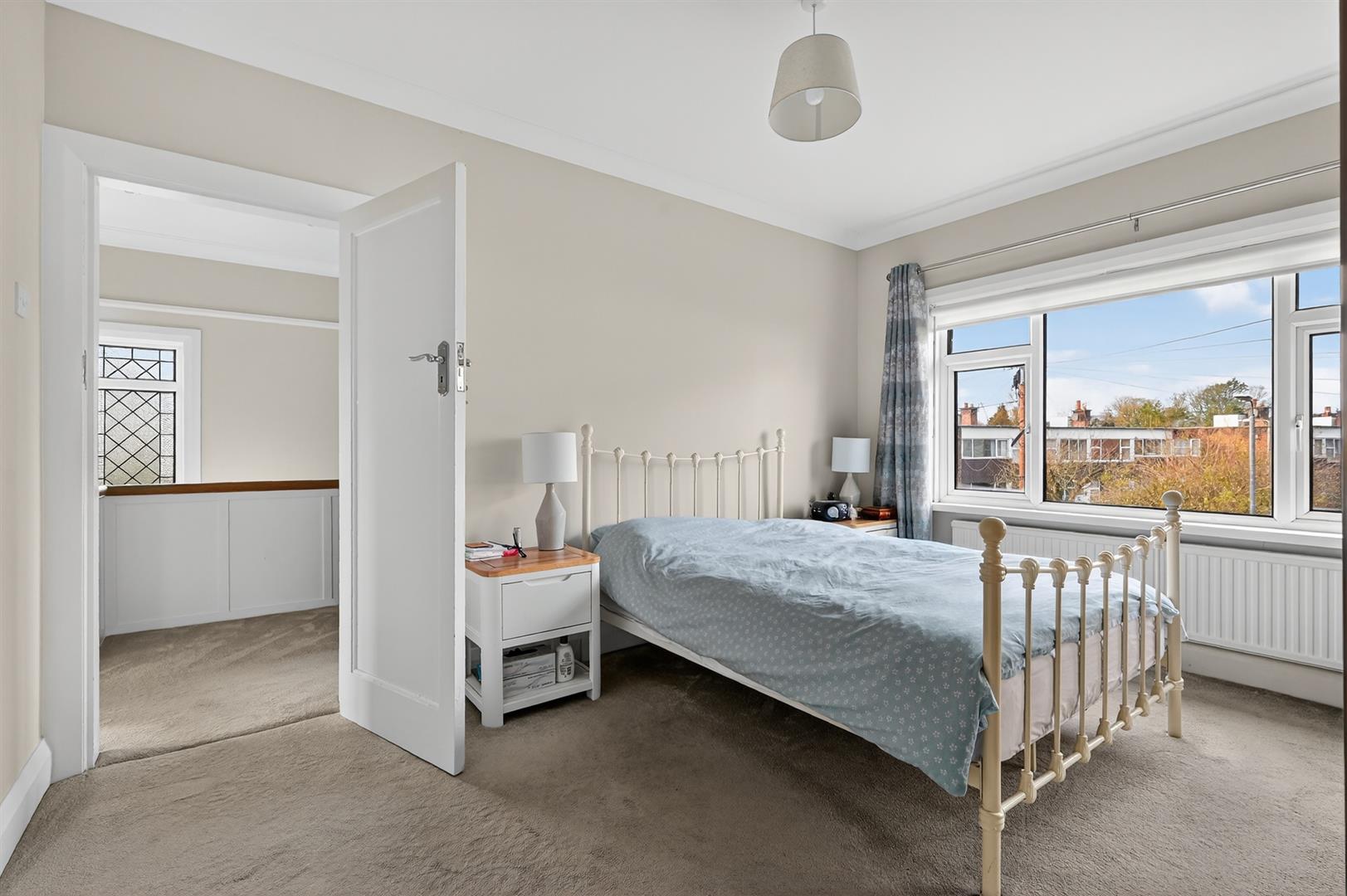 Laminate wood floor. Tiled fireplace. Bay window with stained glass.