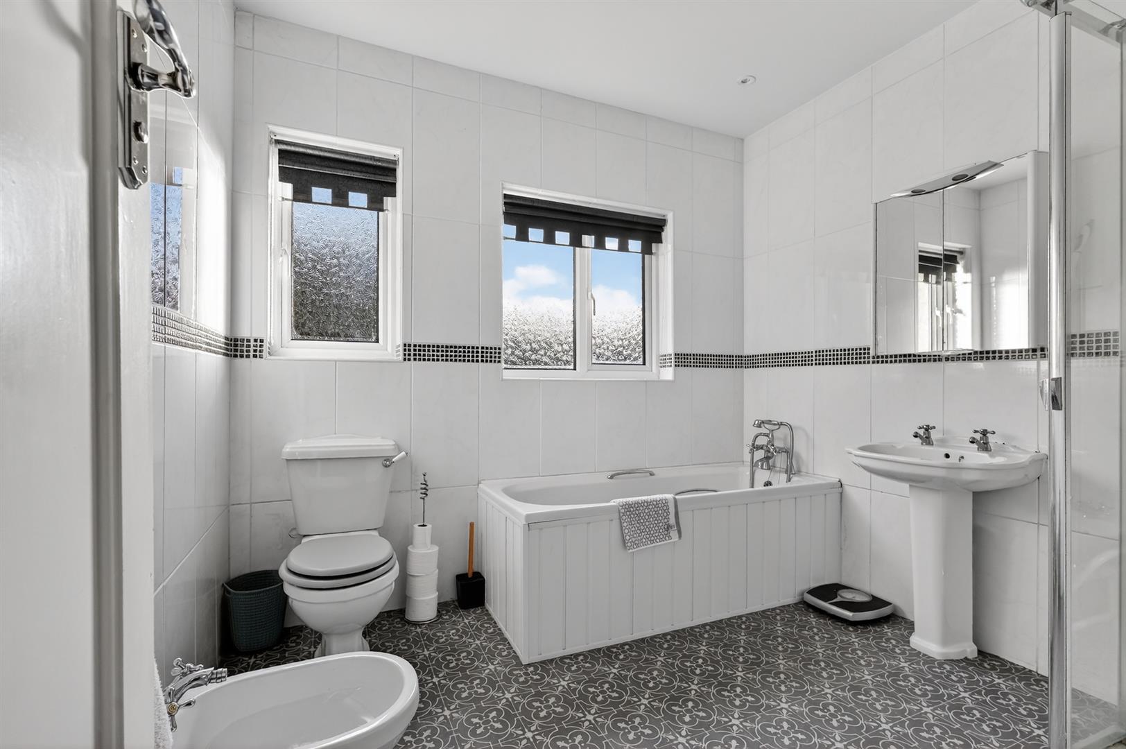 Low flush W.C, pedestal wash hand basin, bidet, bath, walk in shower, fully tiled walls, tiled floor.