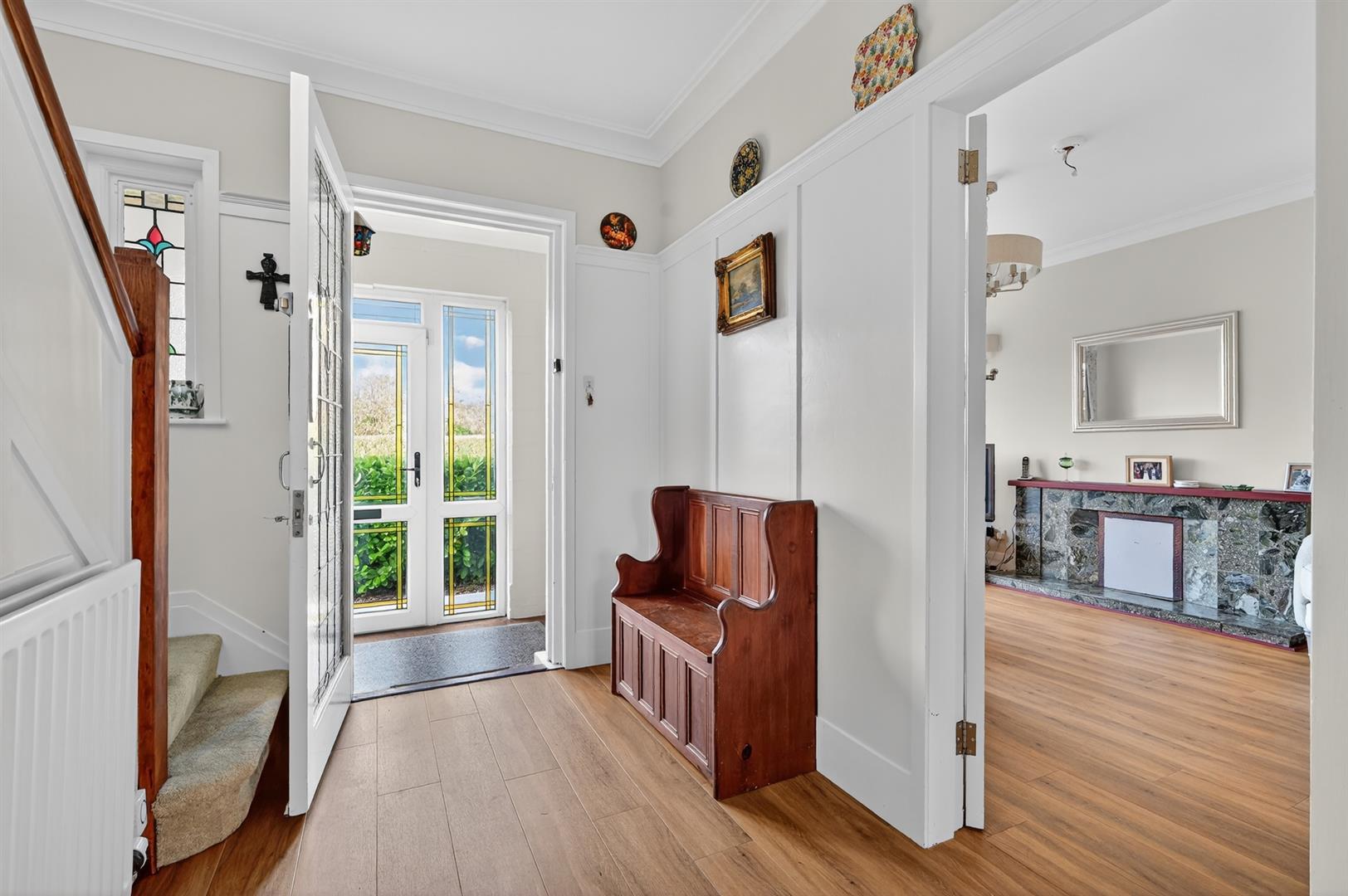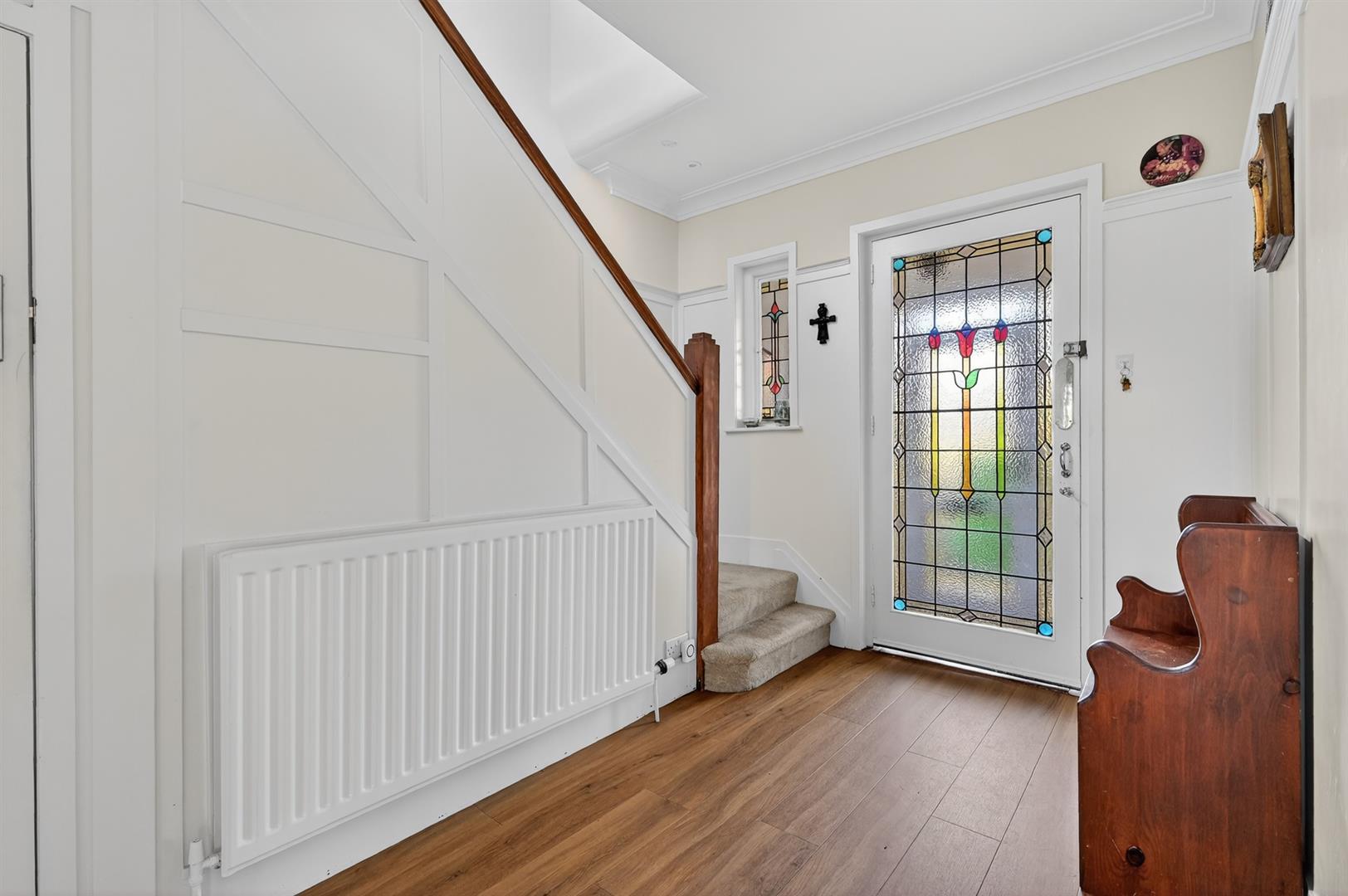 Stained glass entrance door. Laminate wood floor. Storage under stores. Wall panelling.