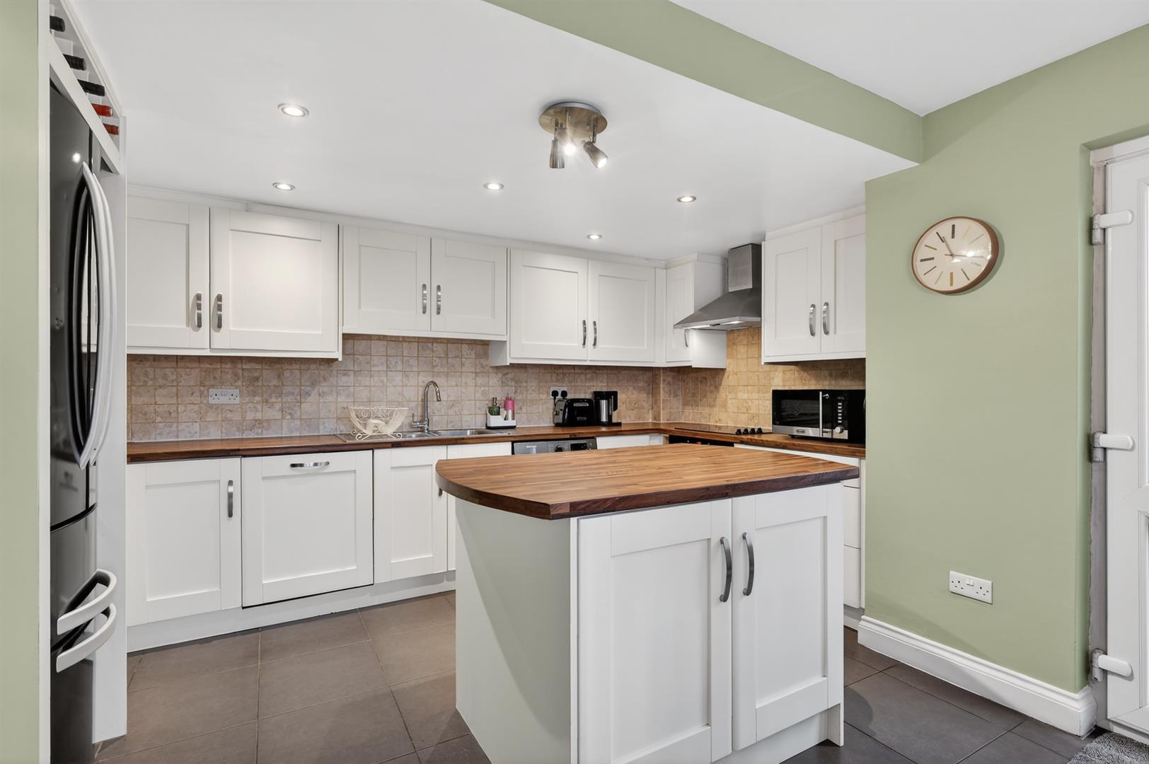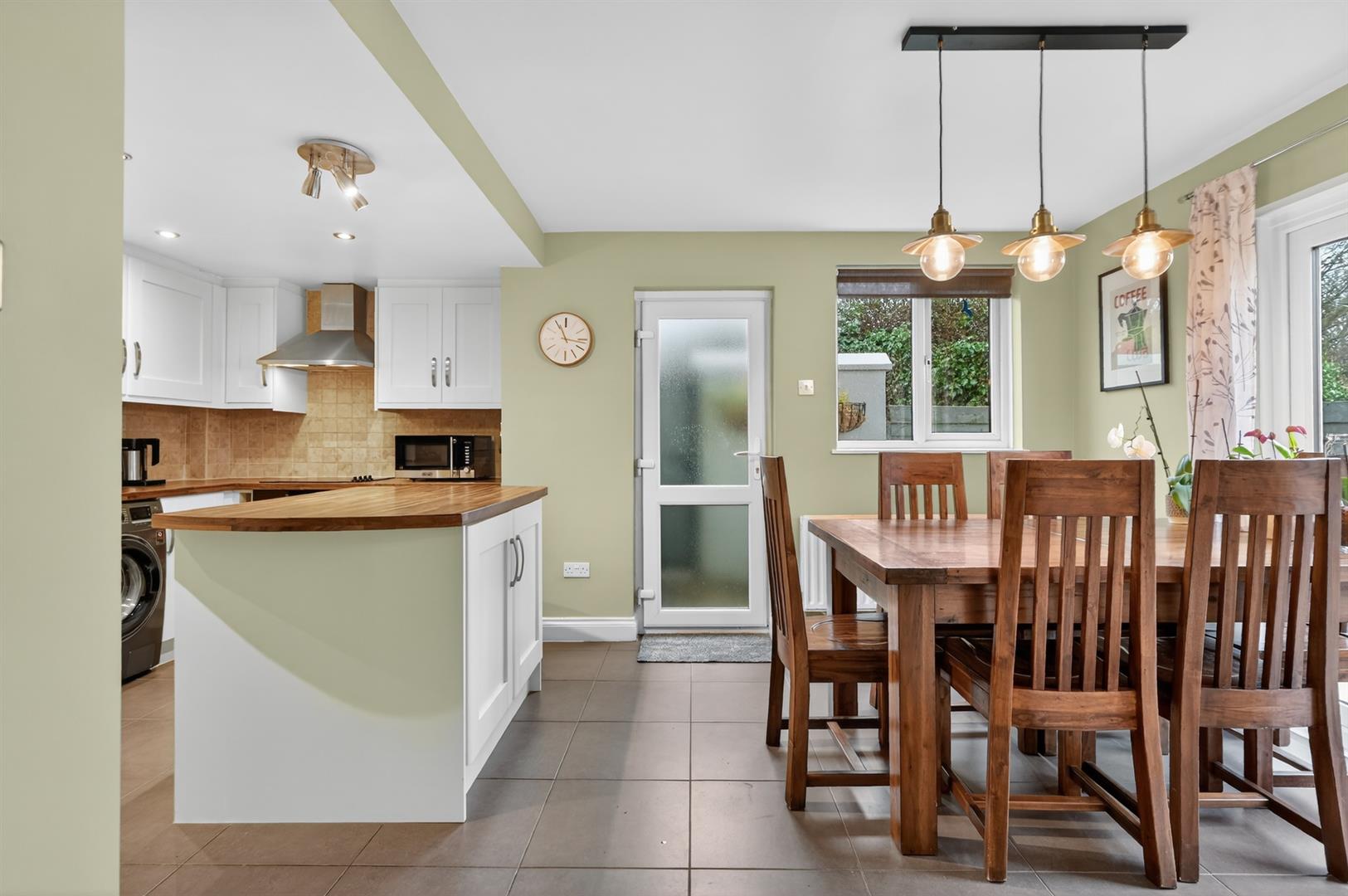 Excellent range of high and low level units, integrated dishwasher, plumbed for washing machine, island, integrated oven, 4 ring hob, stainless steel extractor fan, part tiled walls, stainless steel sink unit with drainer, part tiled walls. PVC double doors to garden.