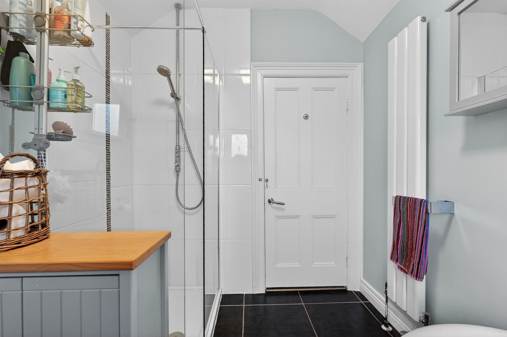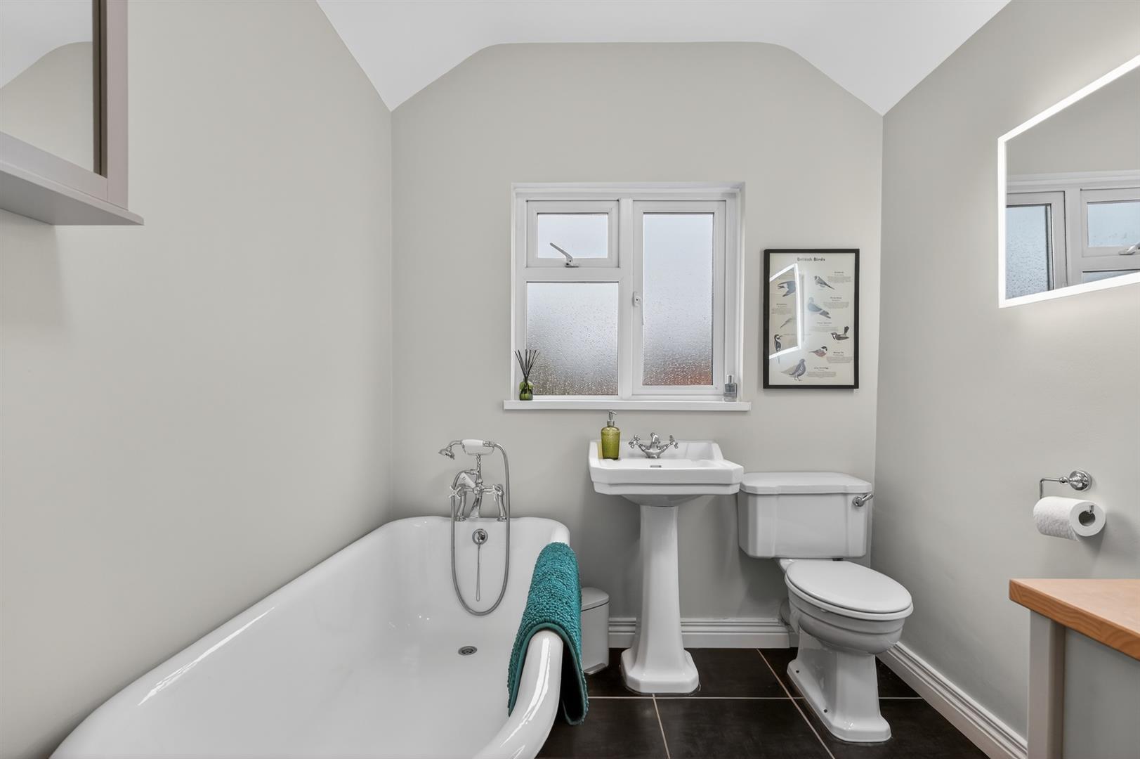 Luxury suite with roll top free standing bath, walk in fully tiled shower enclosure, pedestal wash hand basin, low flush W.C, tiled flooring.