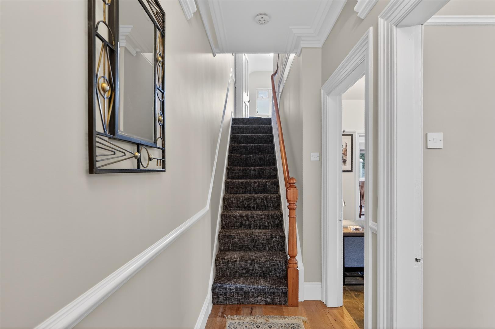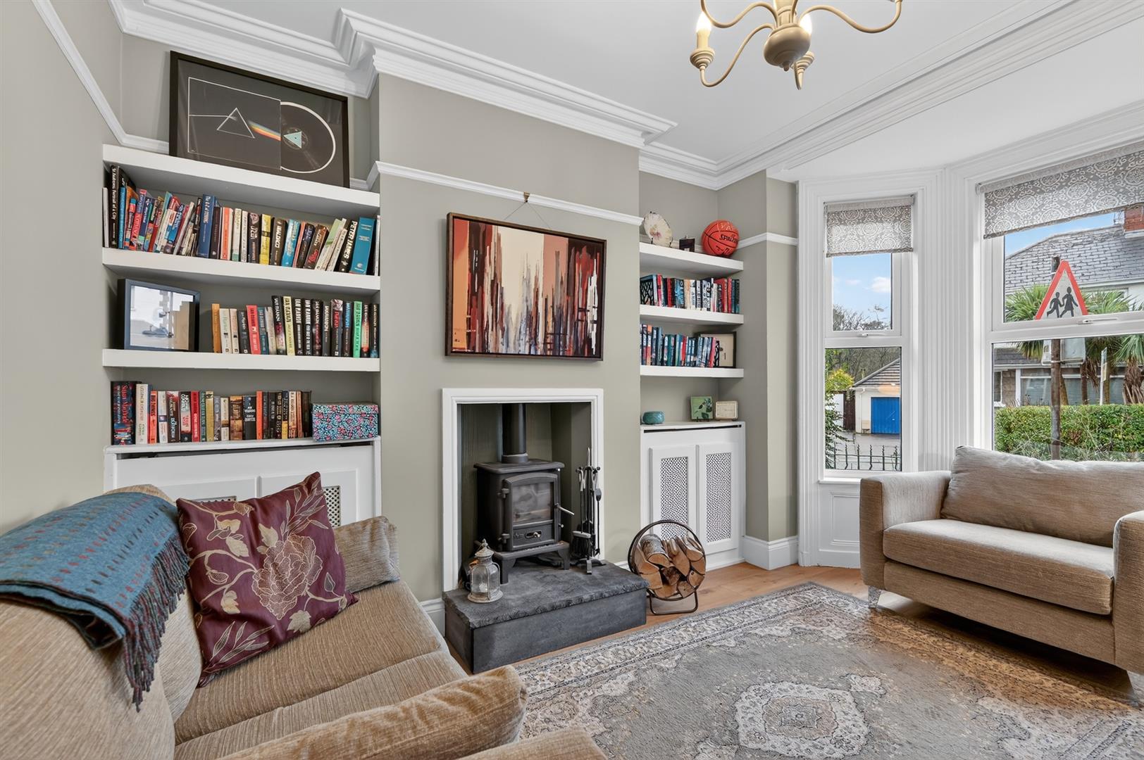 Wooden floor. Wood burning stove. Shelving. Picture rail. Cornice ceiling.