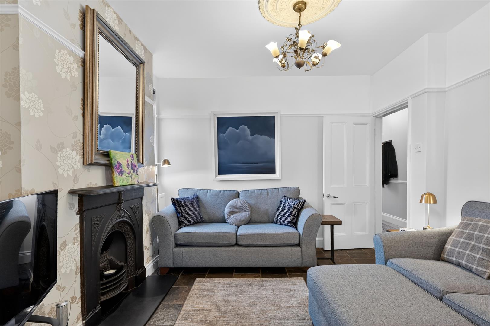 Attractive fireplace. Tiled floor. Picture rail.