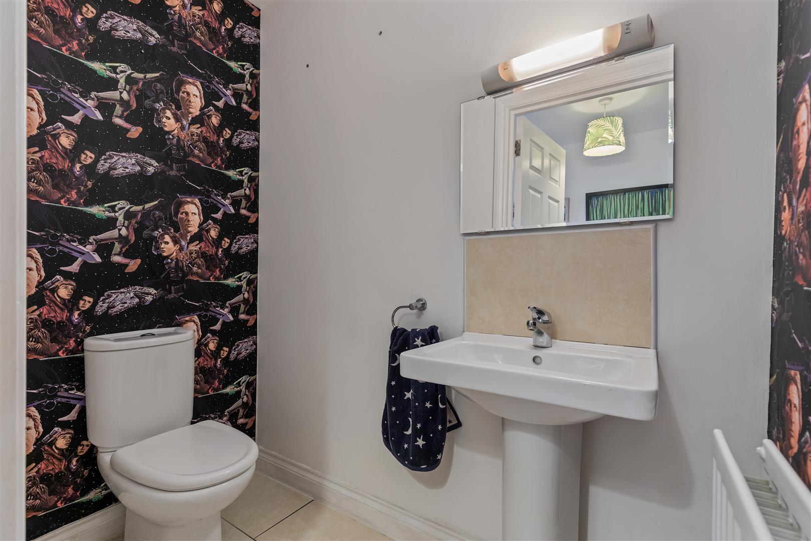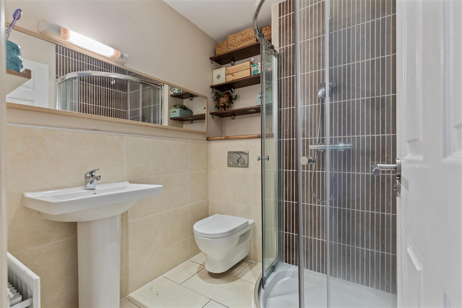 Comprising corner shower cubicle with chrome shower unit, (fully tiled walls in shower cubicle), pedestal wash hand basin with mixer taps, hidden cistern w.c Part tiled walls. Tiled flooring.