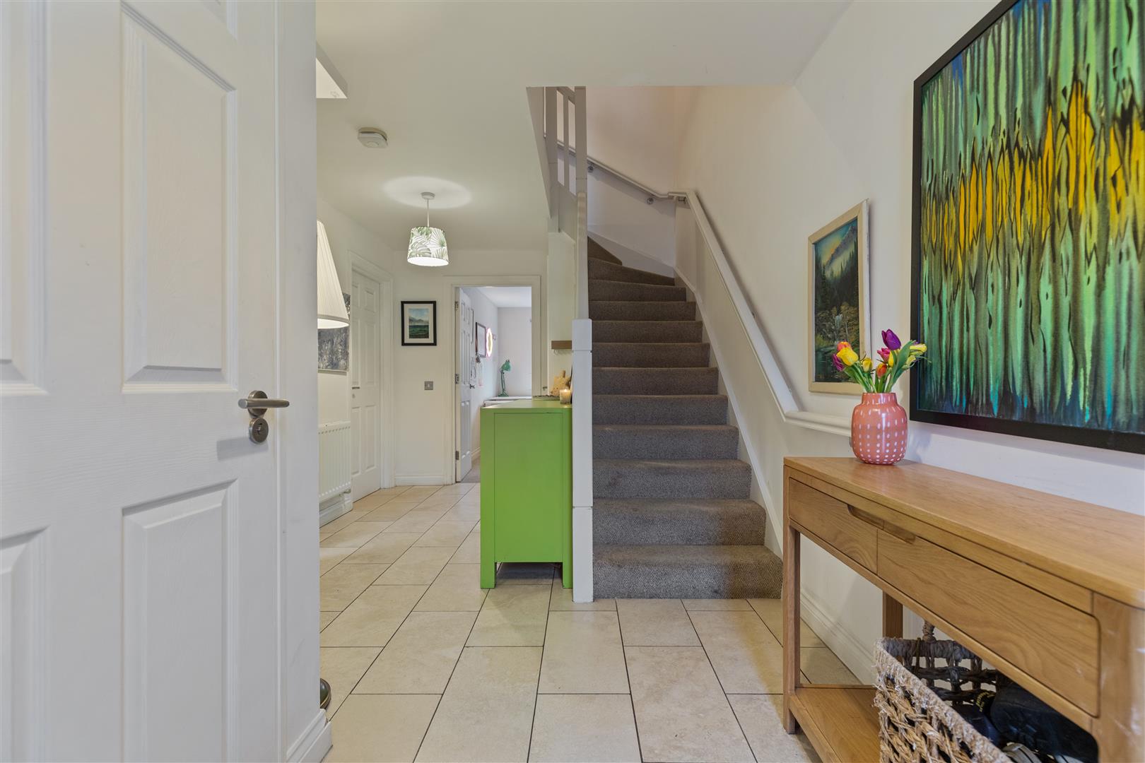 Hardwood front door with glazed side panels to entrance hall. Tiled flooring. Under stairs storage.