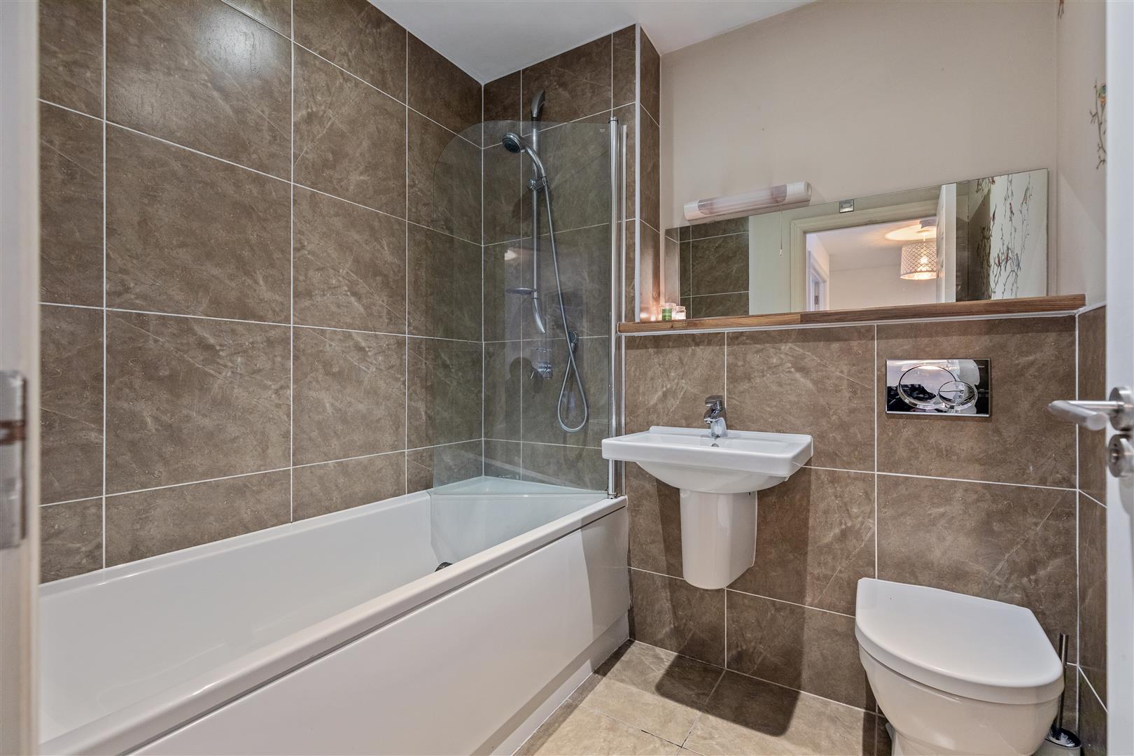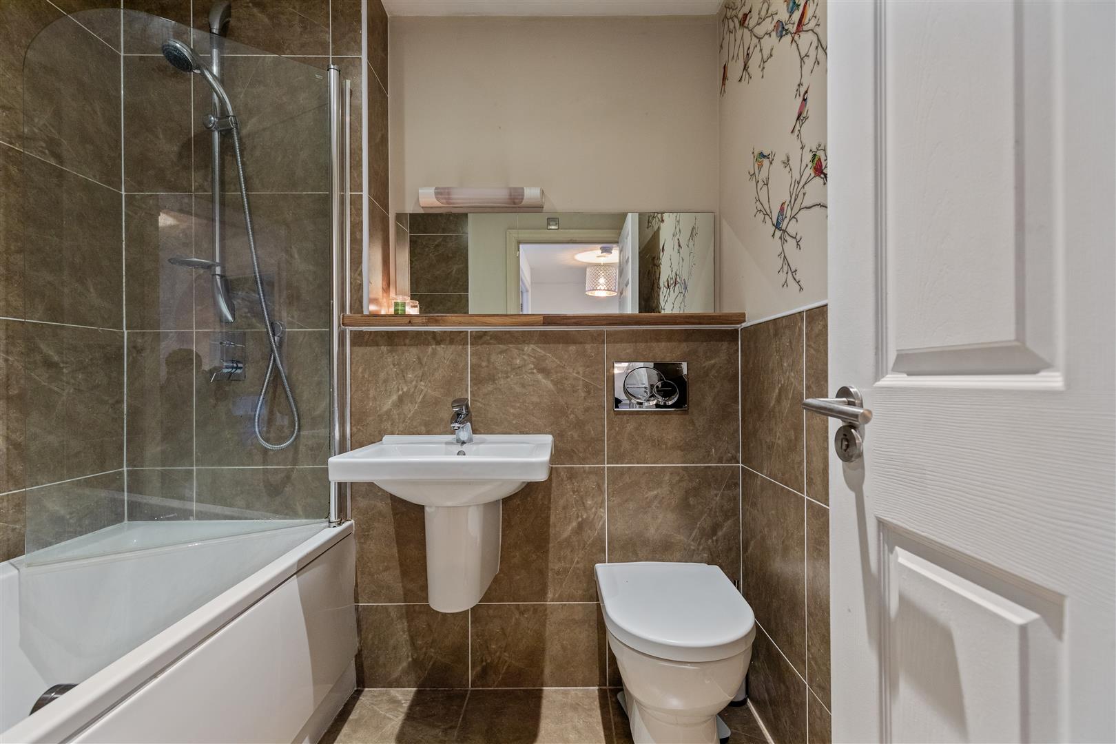 Comprising panelled bath with mixer taps, chrome shower unit above, pedestal wash hand basin, hidden cistern w.c Part tiled walls. tiled flooring. Spot-lights.